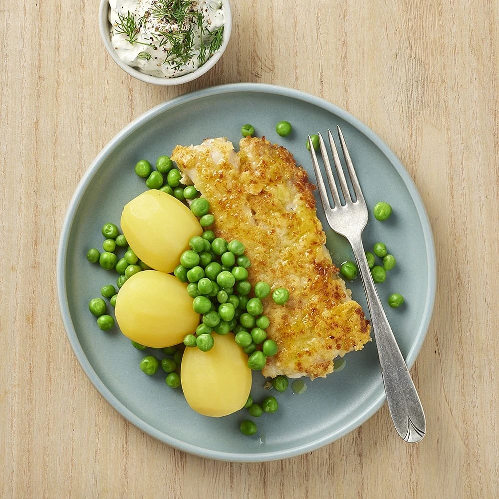 Dillpanerad fisk med remouladsås och ärtor
