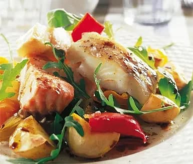 Tomatbakad fisk med rostad potatis