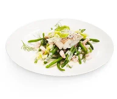 Ugnsbakad fisk med kaviarsås, dill och haricotsvertssallad