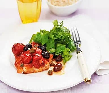 Tomatbakad fisk med kapris och oliver