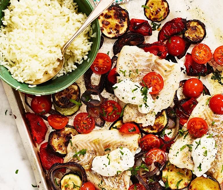Pestobakad fisk och halloumi med rostad blomkål