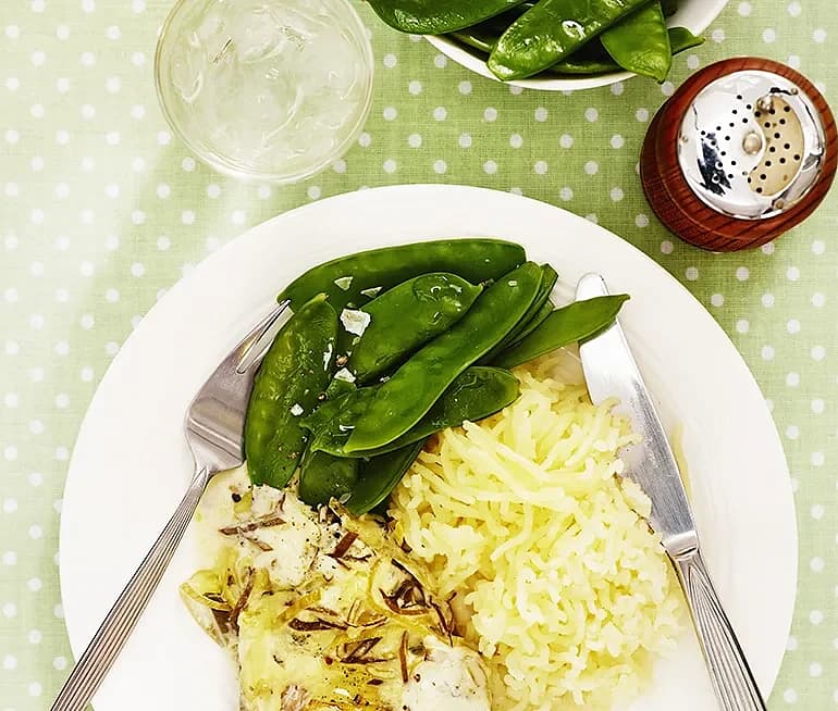Dillbakad fisk med gröna ärtor