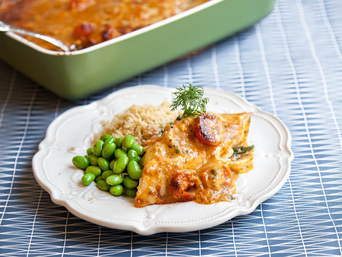 Tomat- och basilikagratinerad fisk med syrliga edamamebönor