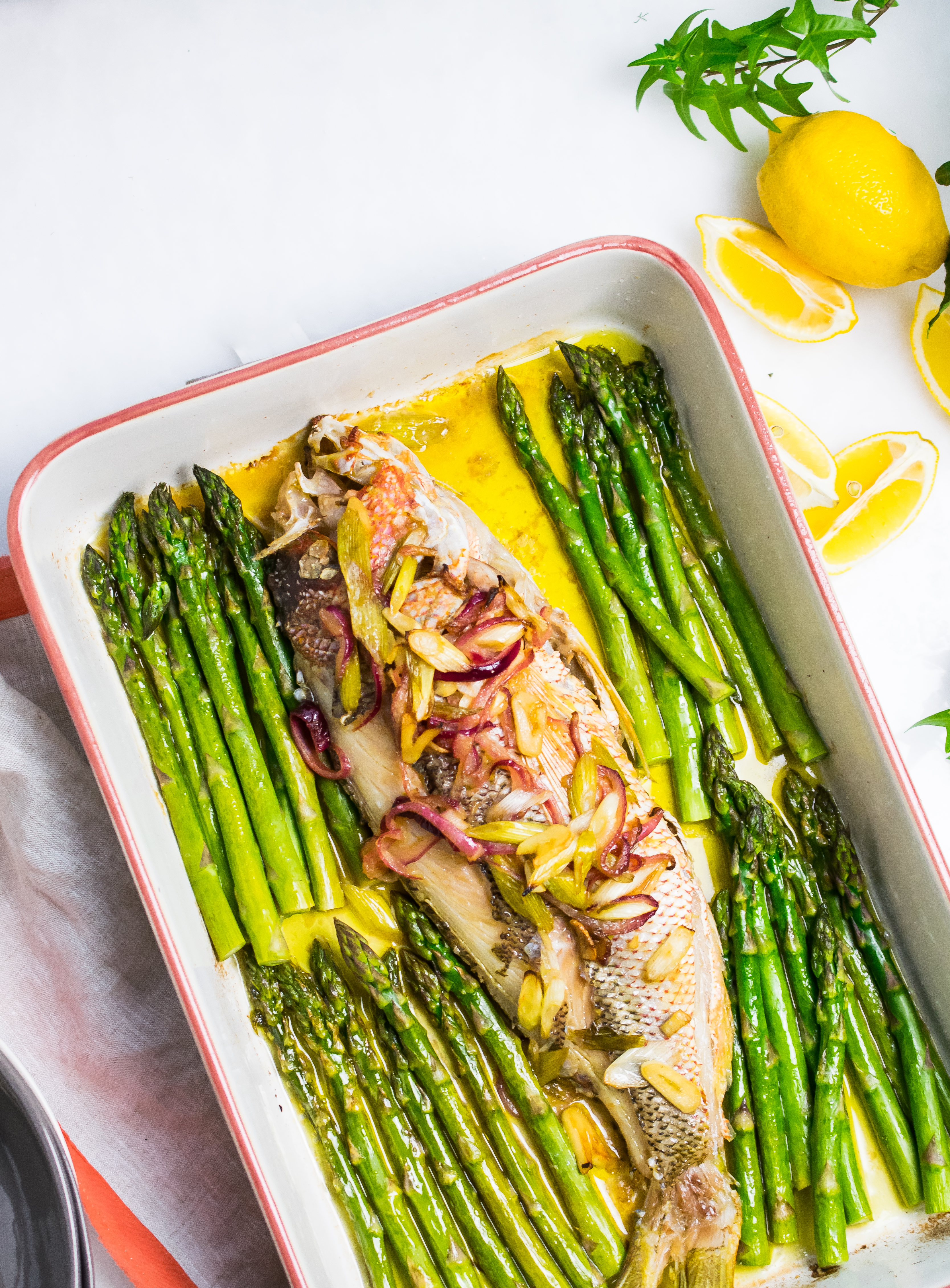 Hel fisk i ugn med salladslök och sparris