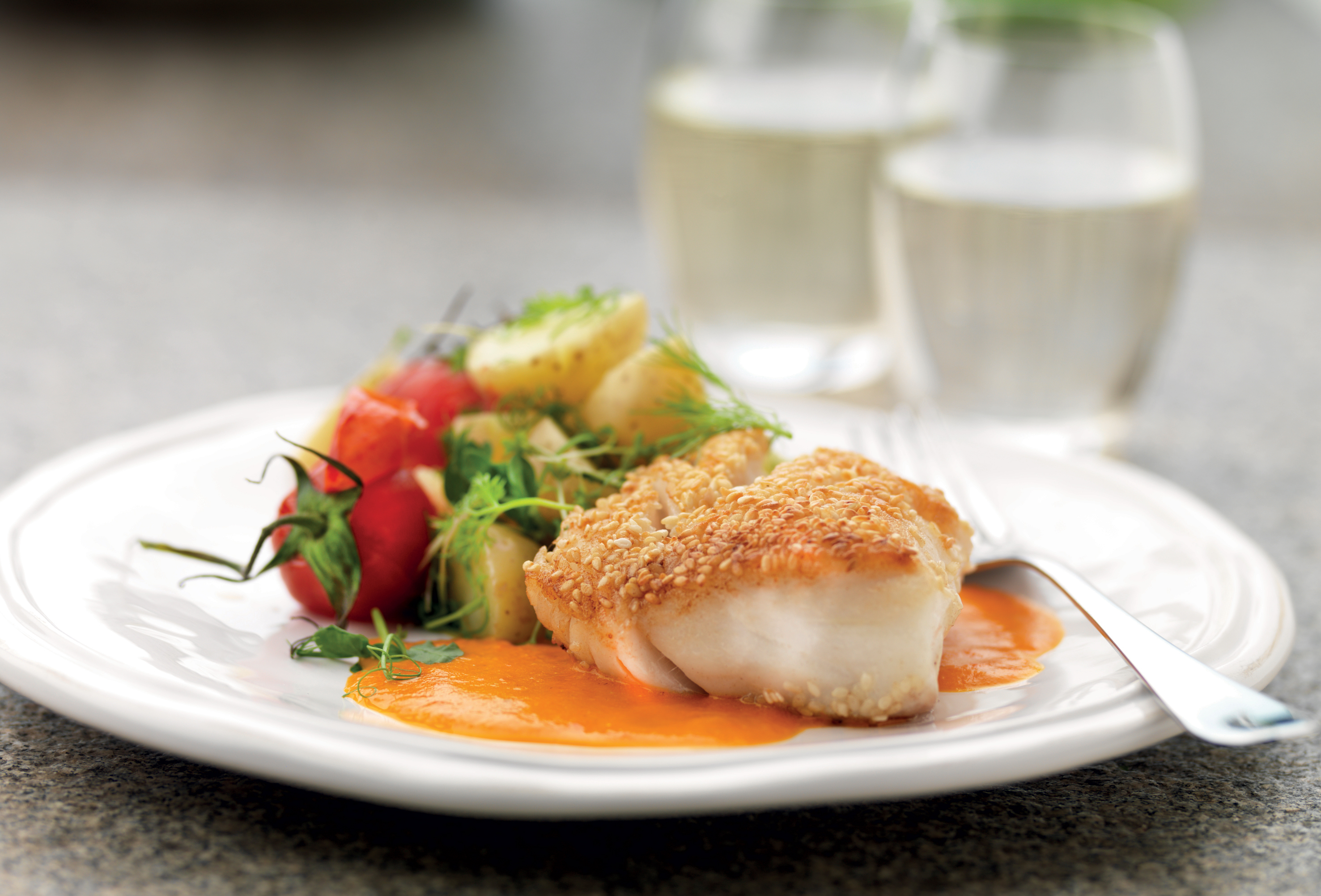 Sesampanerad fisk med tomatsmörsås