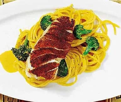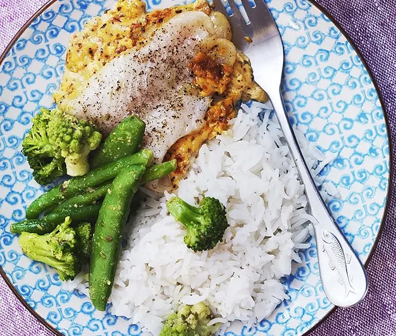 Kryddhalstrad fisk med mild curryspagetti