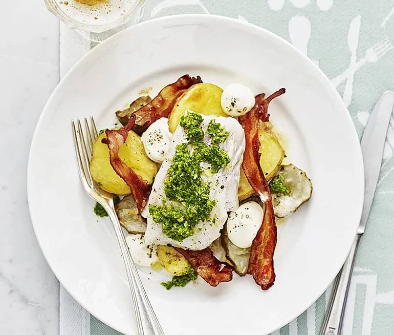 Tinas ugnsbakade fisk med jordärtskocka och bacon