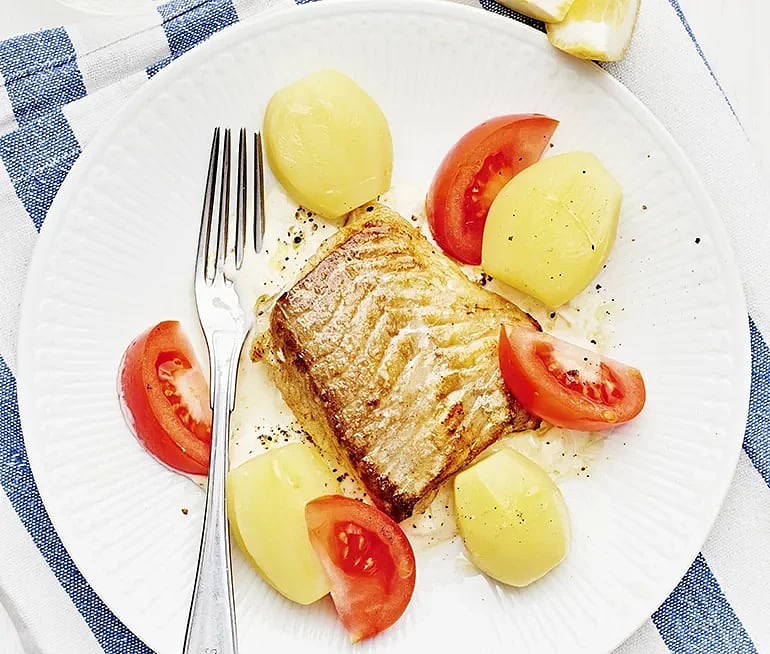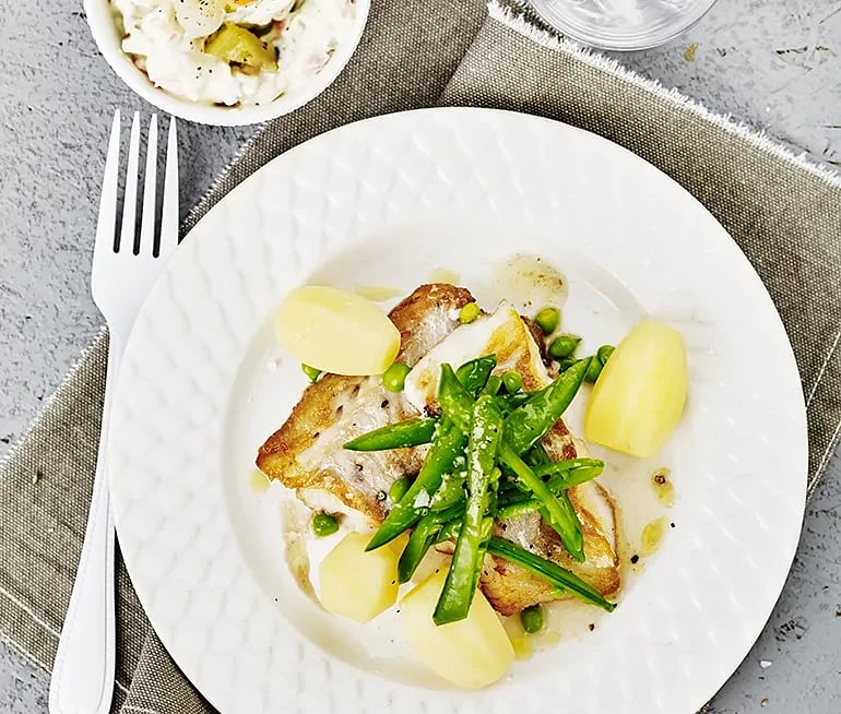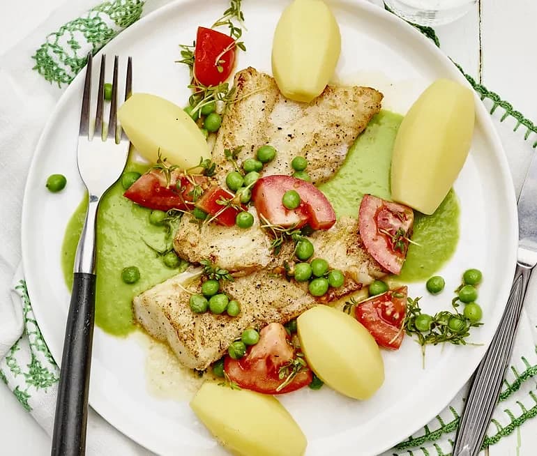 Stekt fisk med ärtsås och tomatsallad