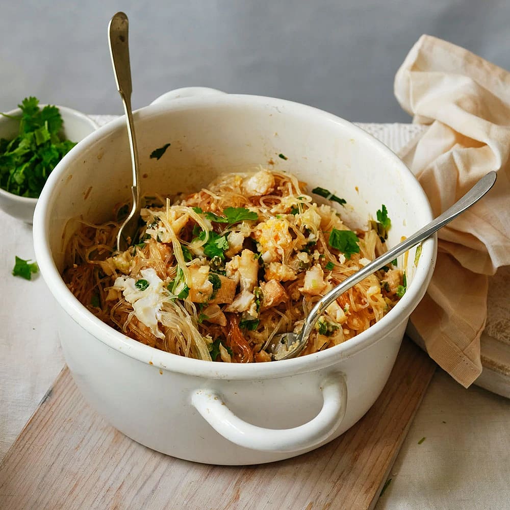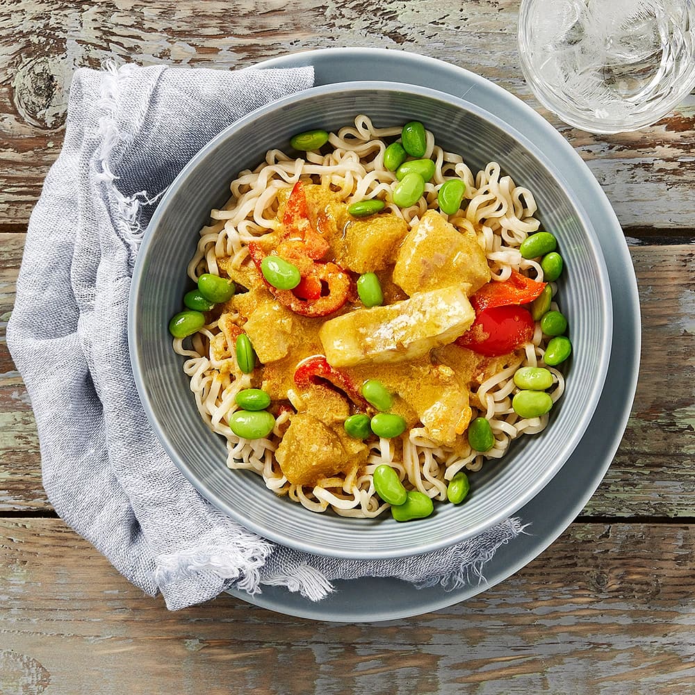 Fisk i gul curry med nudlar och sojabönor