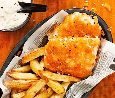 Fish’n chips - Frasig fisk med remouladsås och potatisklyftor