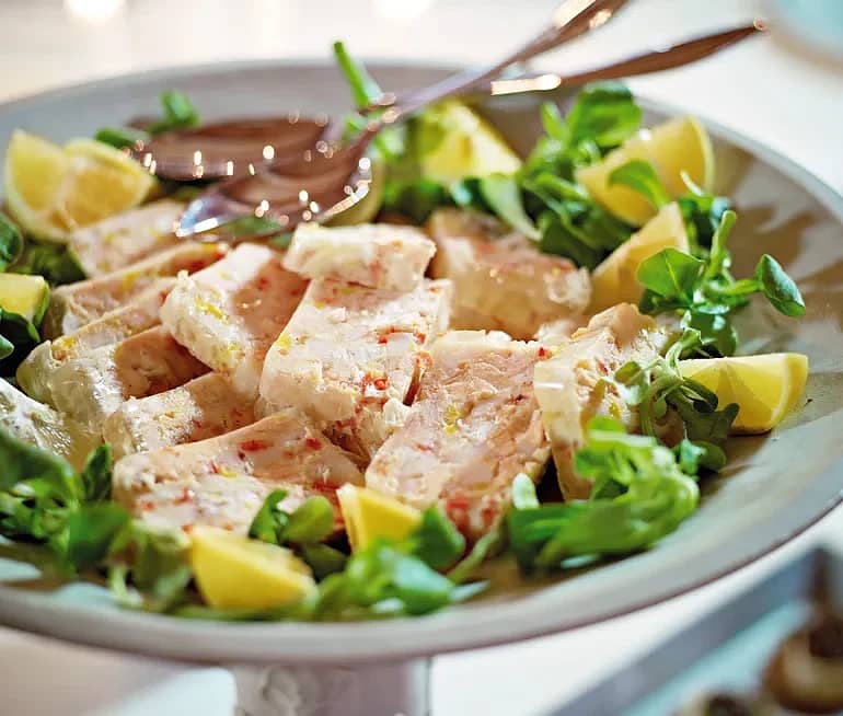 Fisk- och räkmosaik med dillcrème