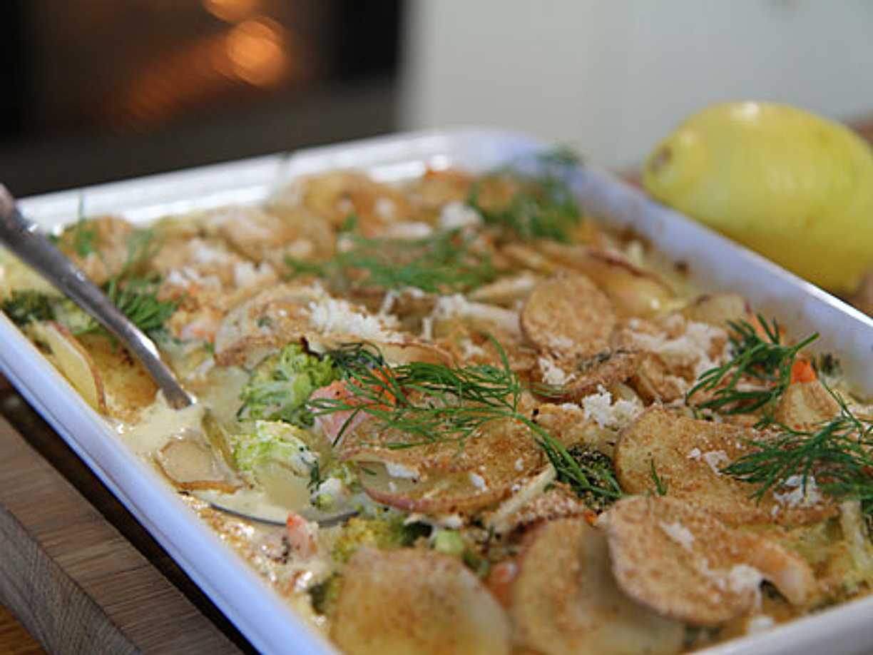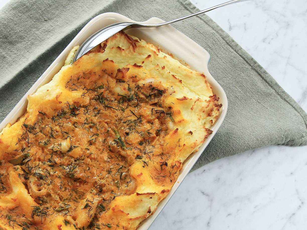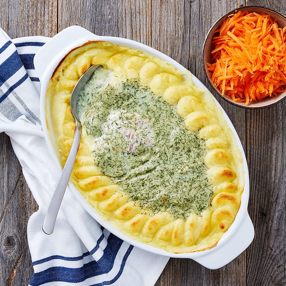Fiskgratäng med dillsås, potatisstomp och parmesantäcke