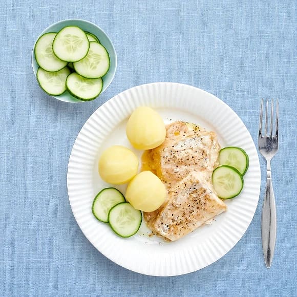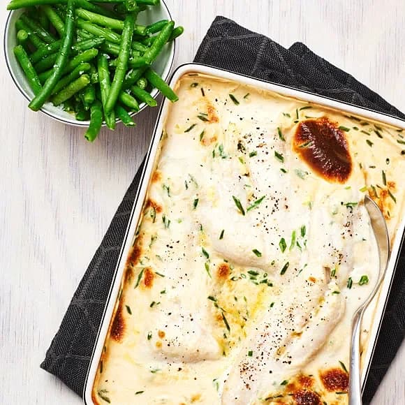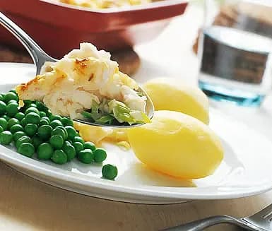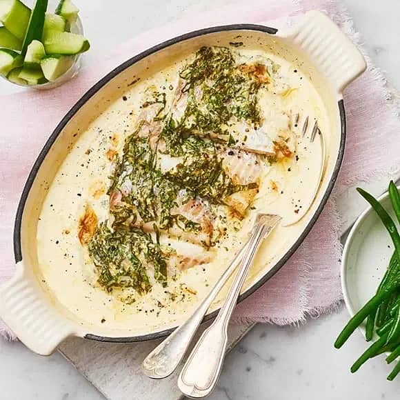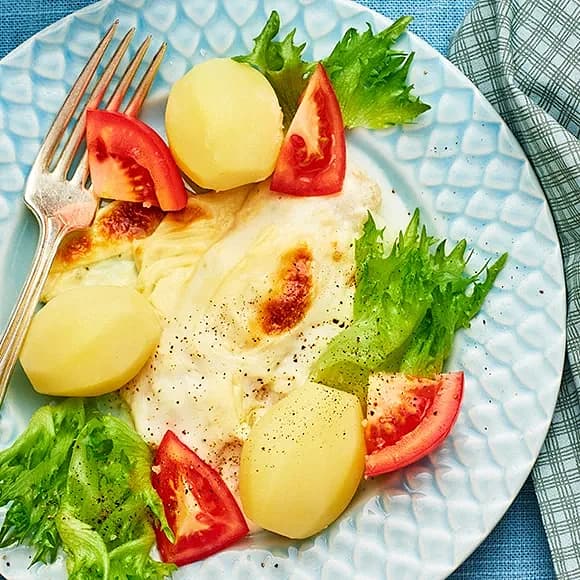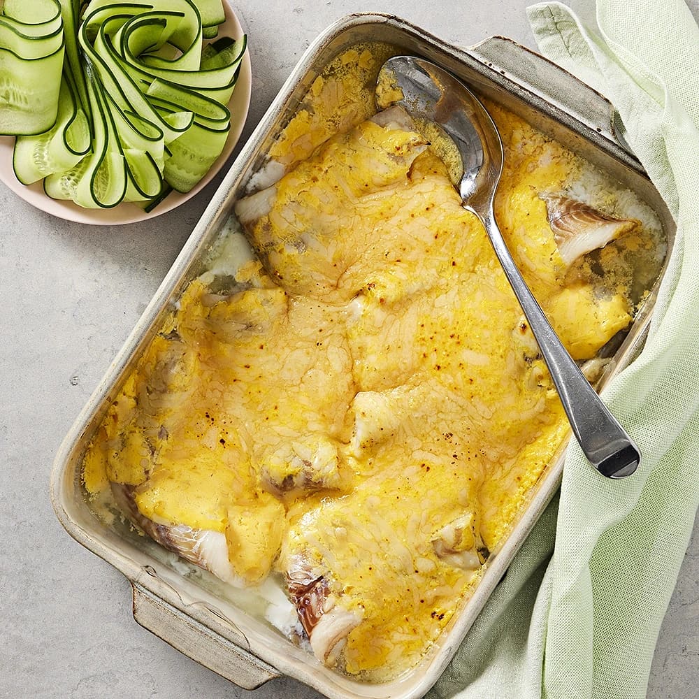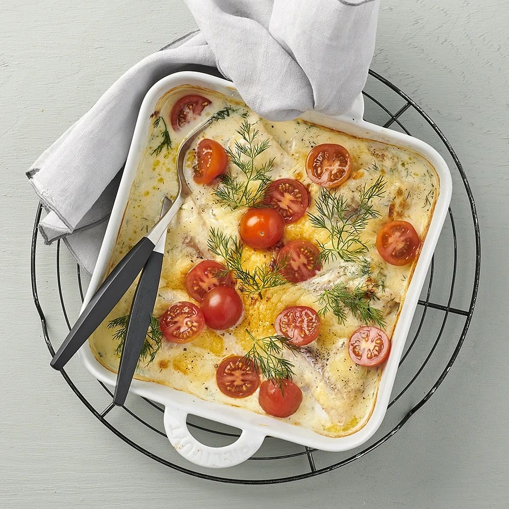 Fiskgratäng med dillsås, potatisstomp och parmesantäcke