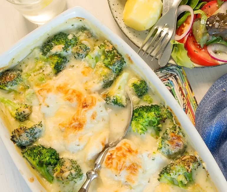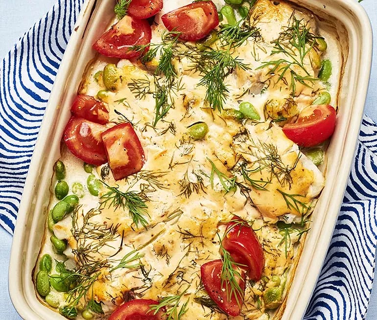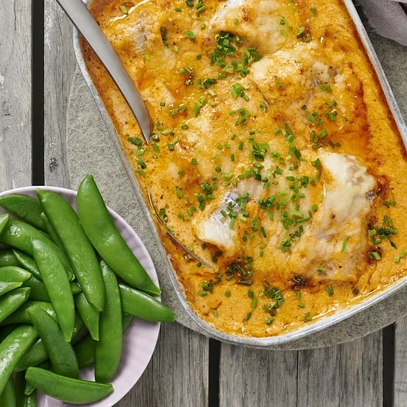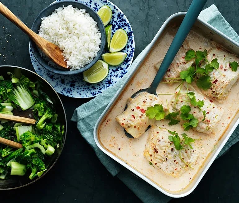 Fiskgratäng med krämig kokossås och wokade grönsaker
