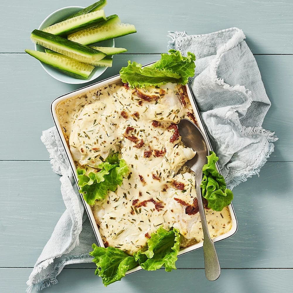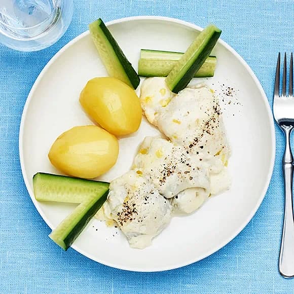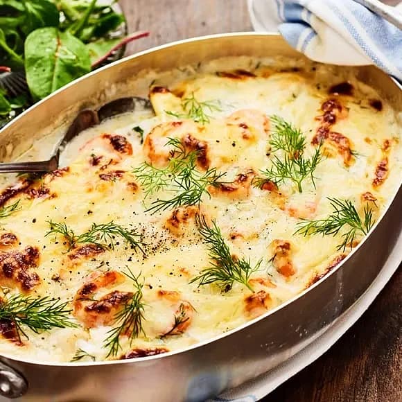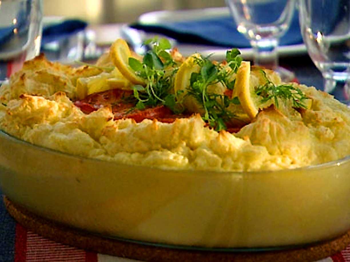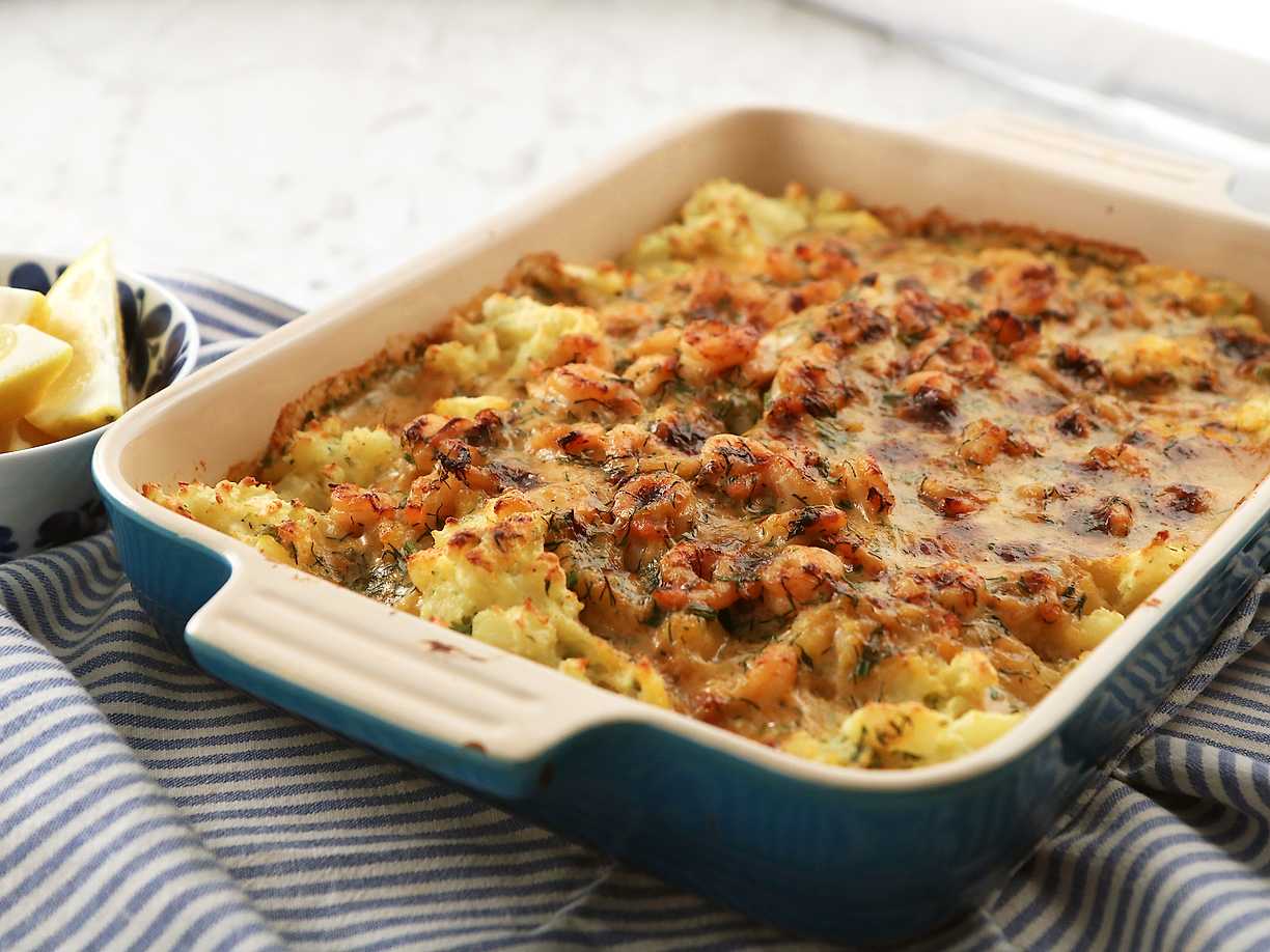 Lisa Lemkes fiskgratäng med räk- och dillsås