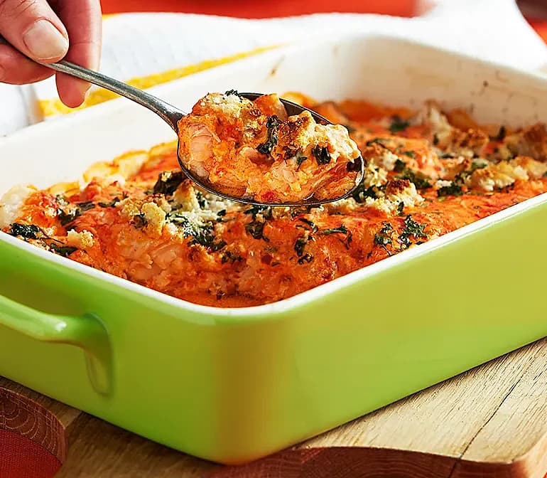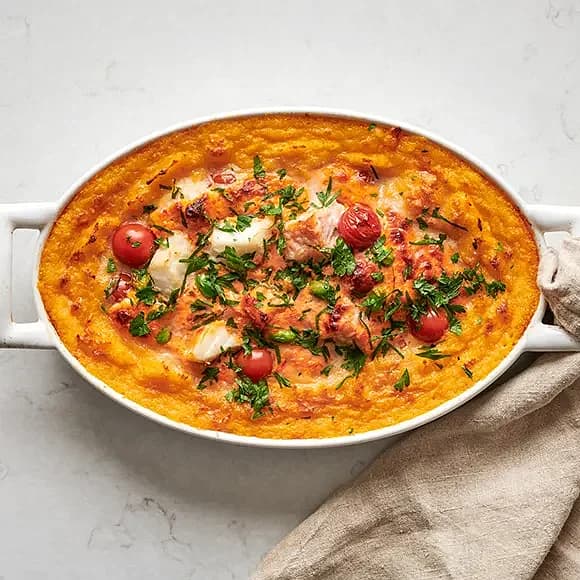 Snabb fiskgratäng med ajvar och parmesankrisp
