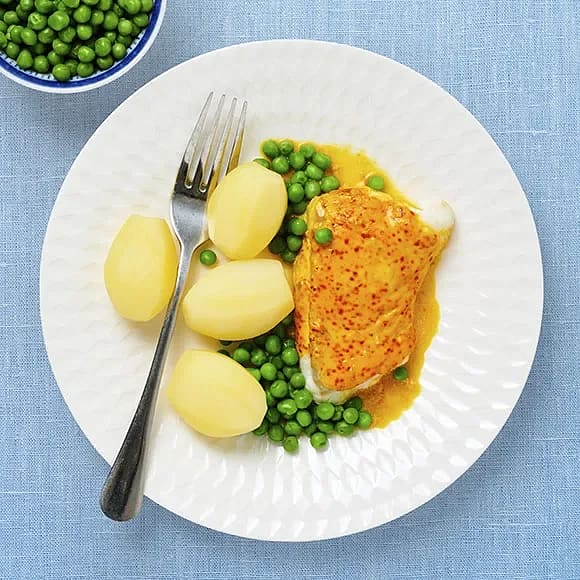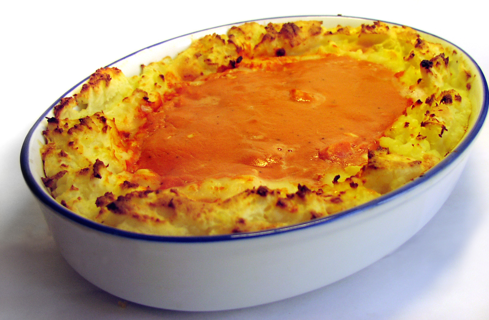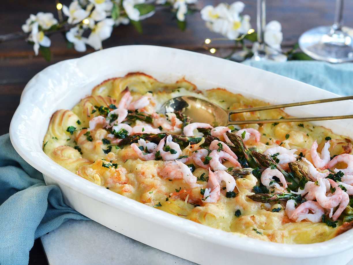 Fiskgratäng med curry, räkor och spritsat potatismos