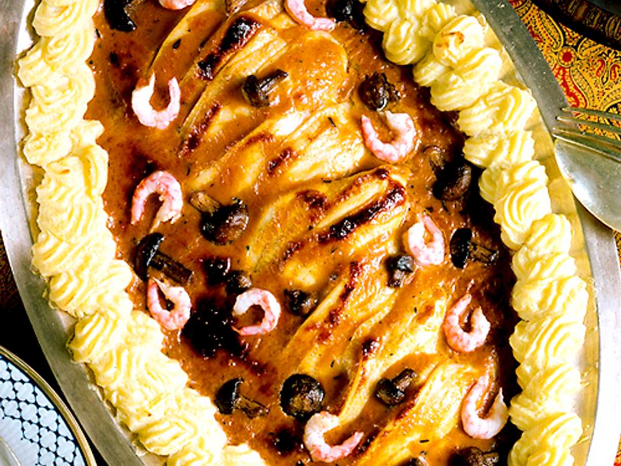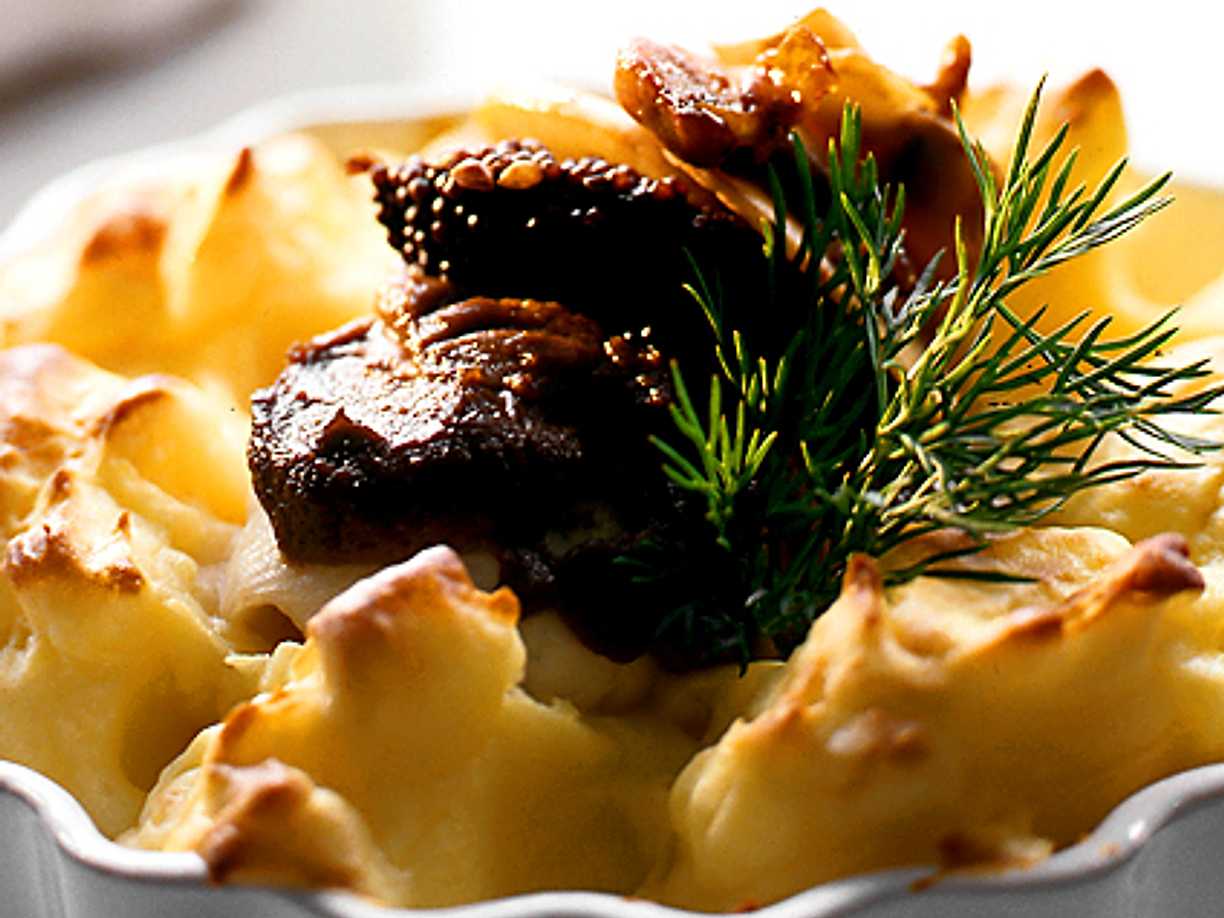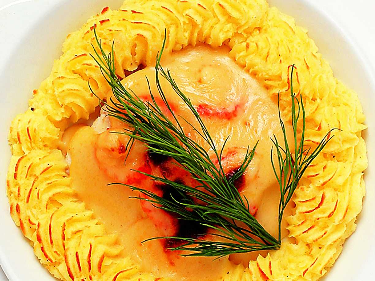 Omvänd fiskgratäng med blåmusselsås och duchesse