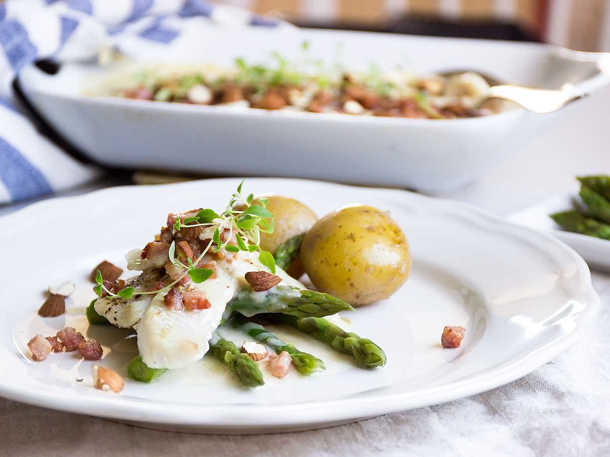 Fiskgratäng med mandel, potatistoppar, spenat och citron