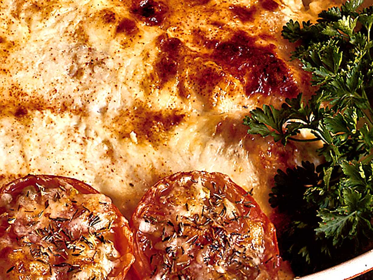 Fiskgratäng med tomat och pommes duchesse