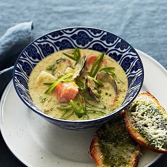 Örtig fiskgryta med vongolemusslor och grillat bröd