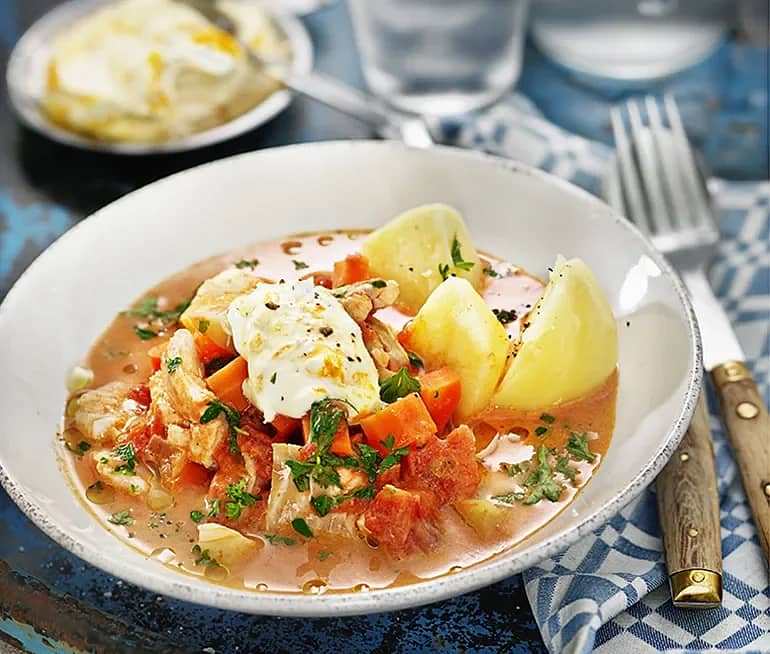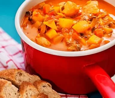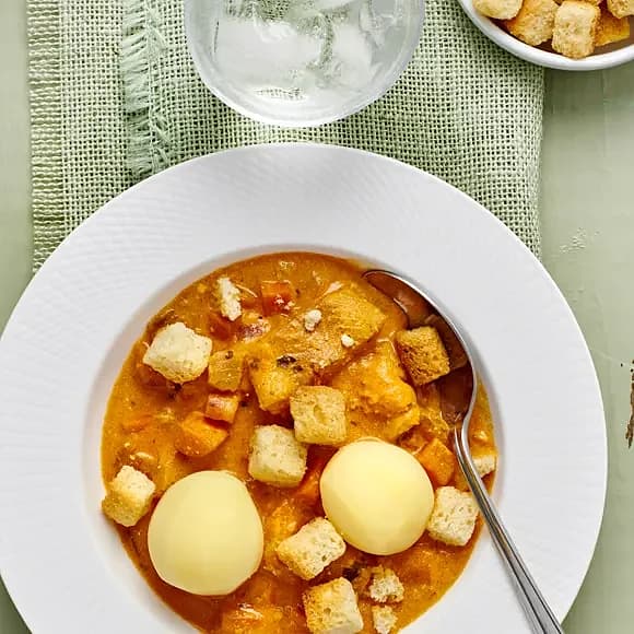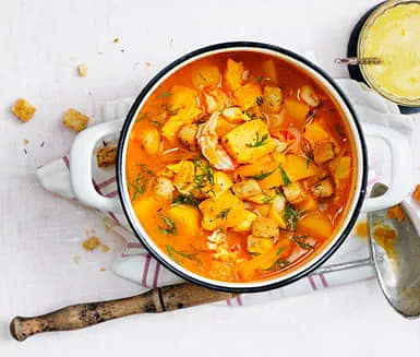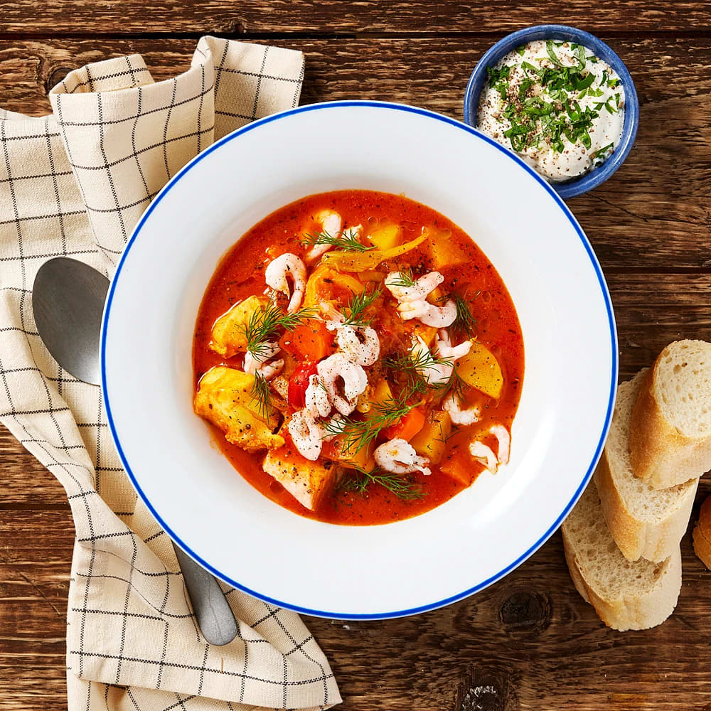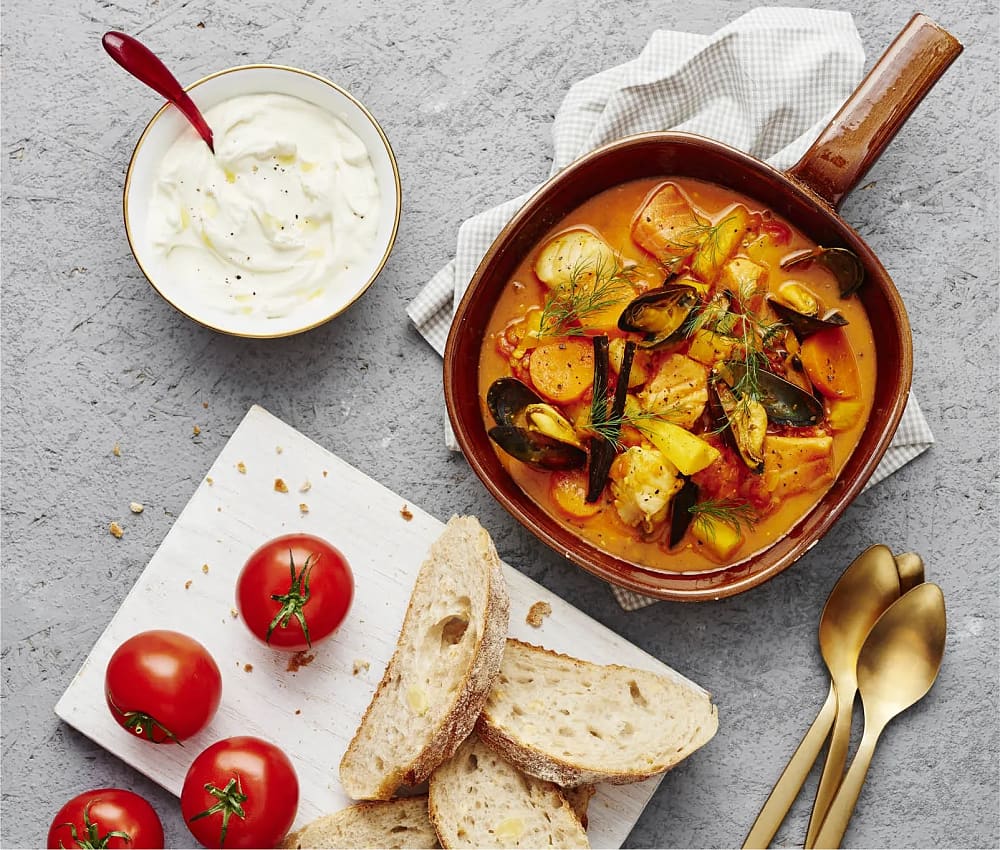 Fiskgryta med musslor, krutonger och vitlöksmajonnäs