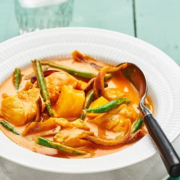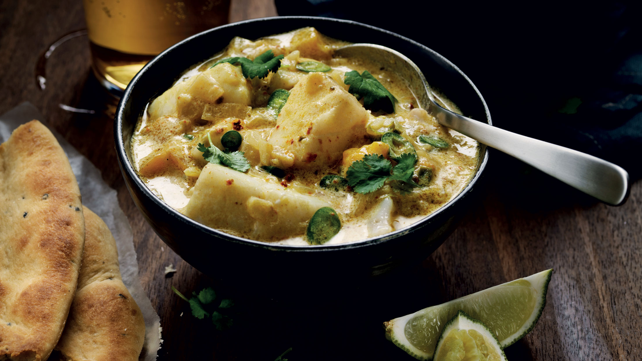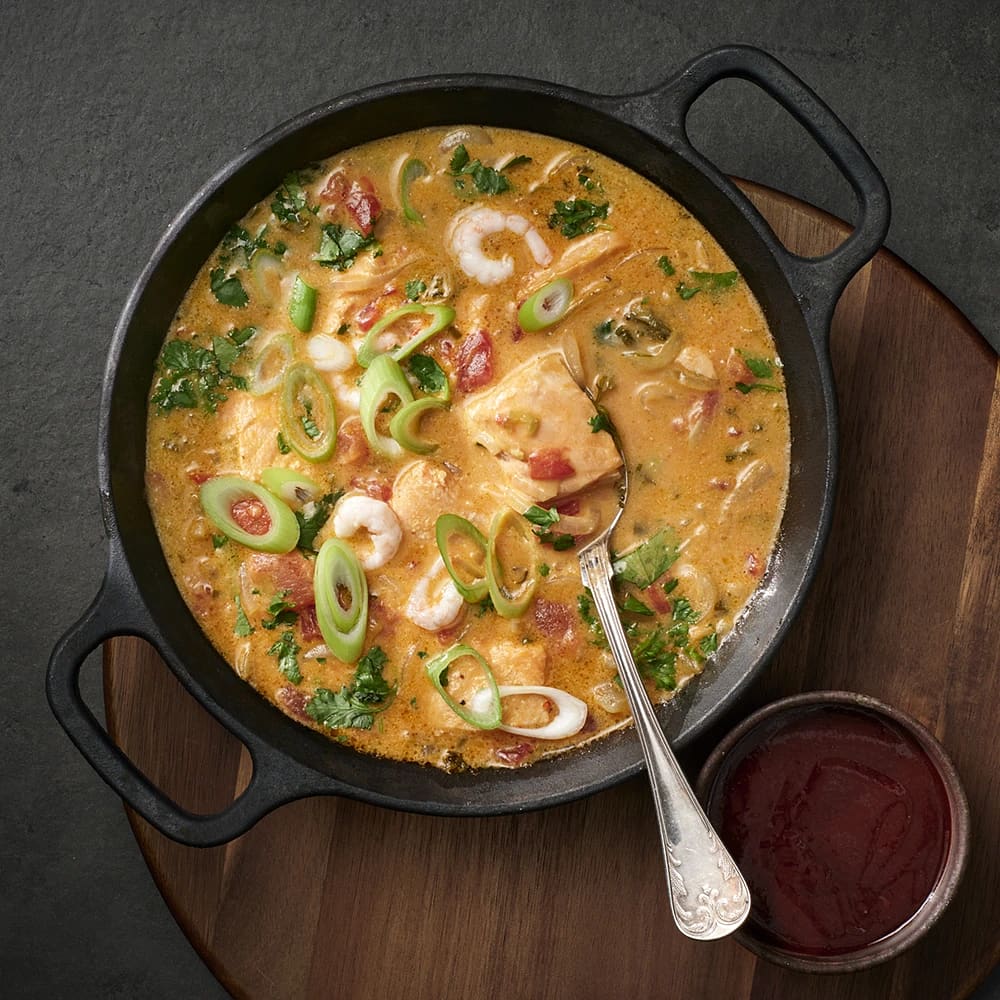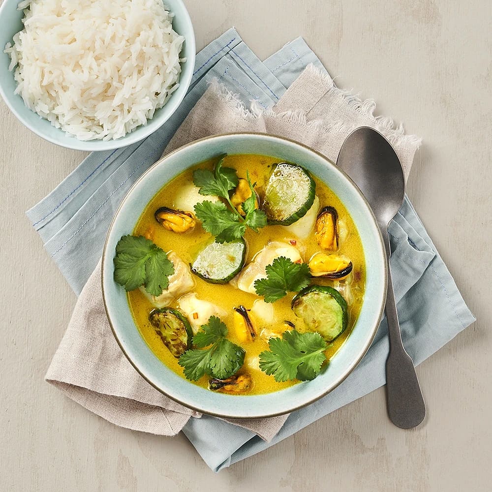 Fiskgryta med kokosgrädde, grön curry och limeyoghurt