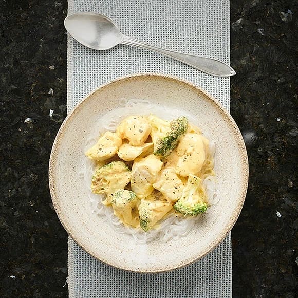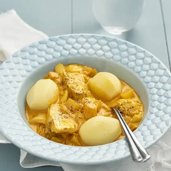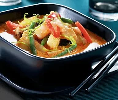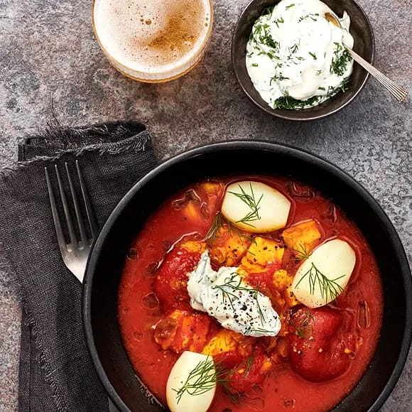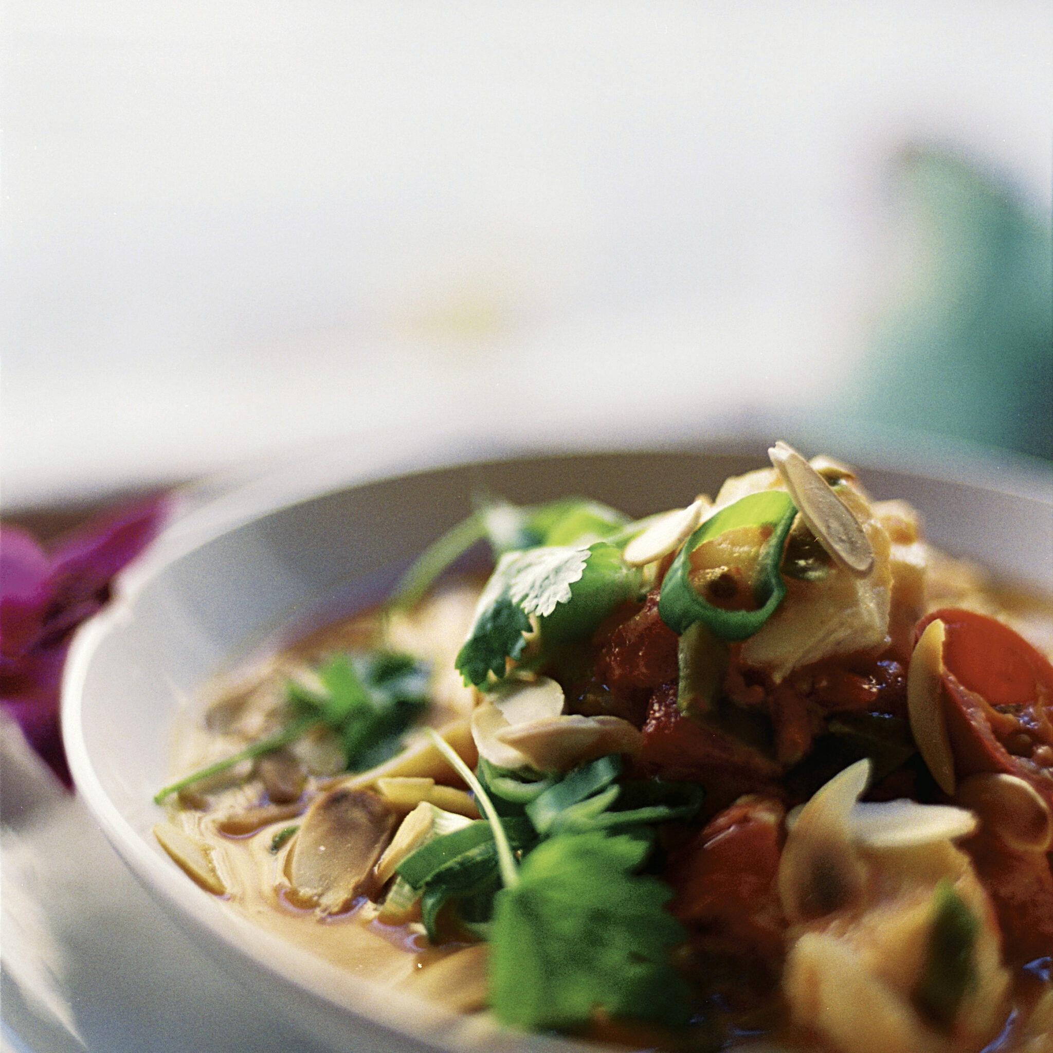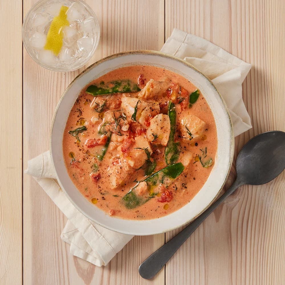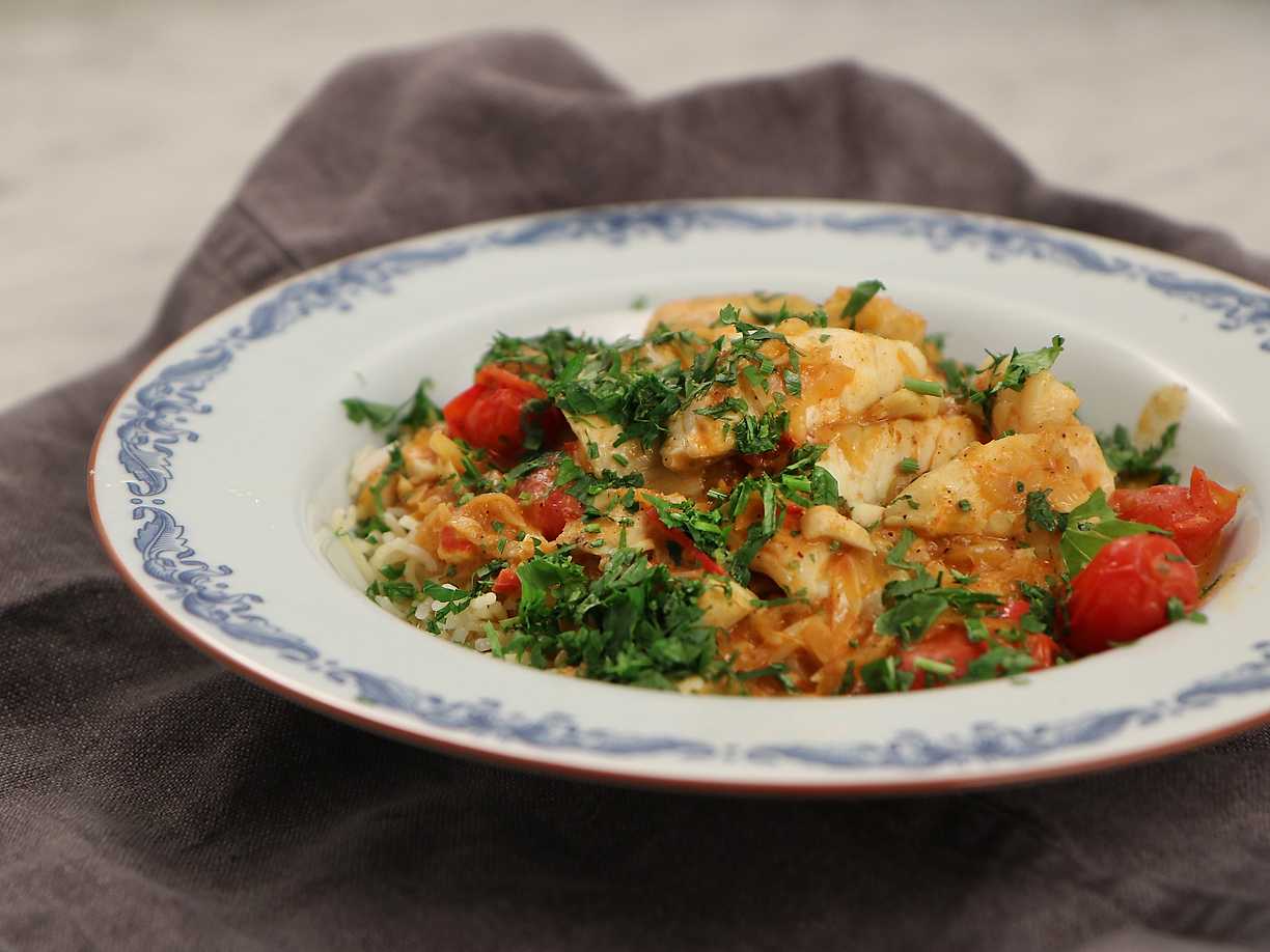 Fiskgryta med kokosgrädde, grön curry och limeyoghurt