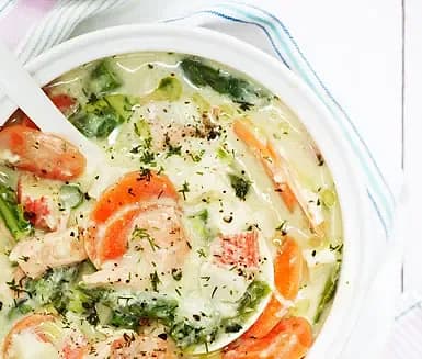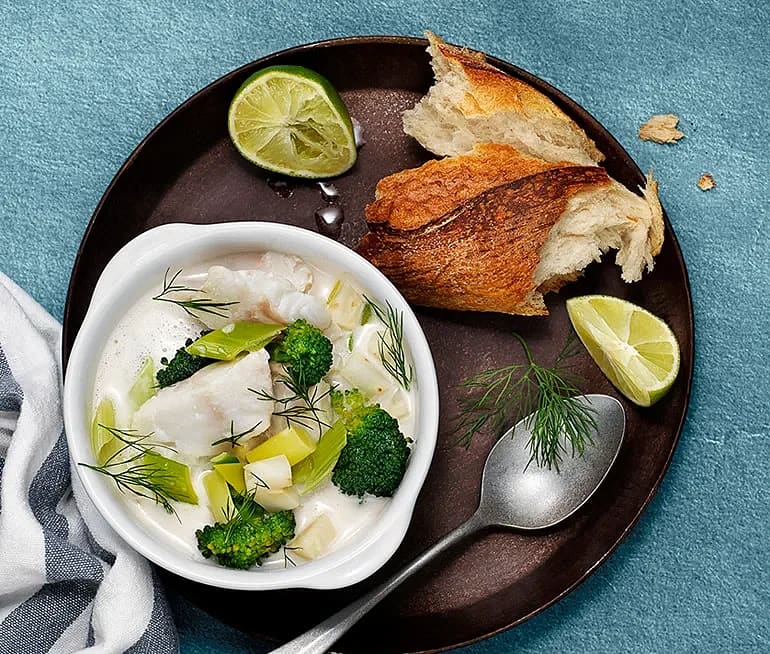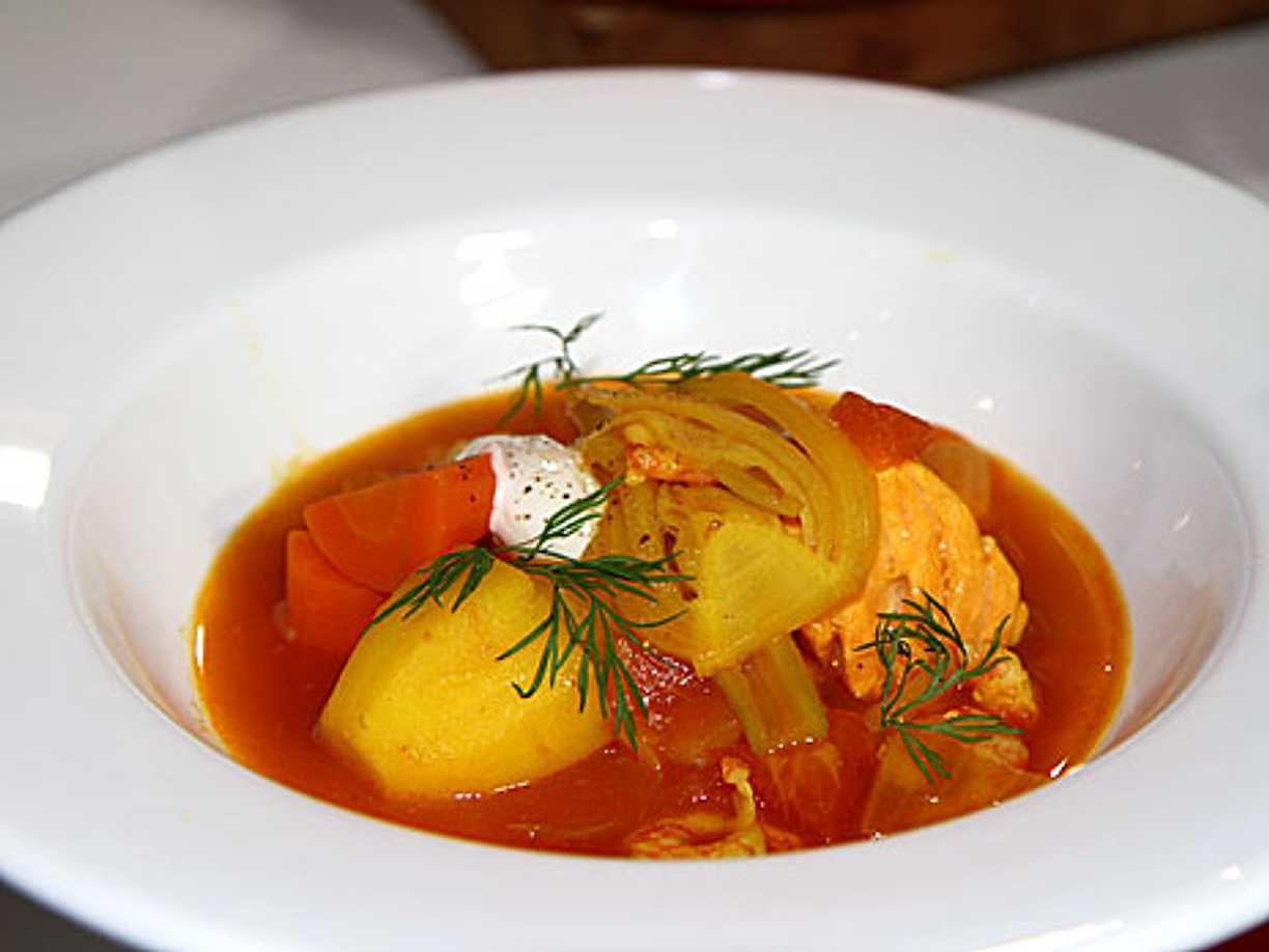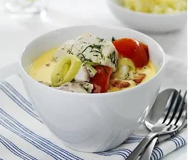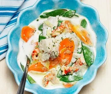 Fiskgryta med lax, torsk, blåmusslor och dillkräm