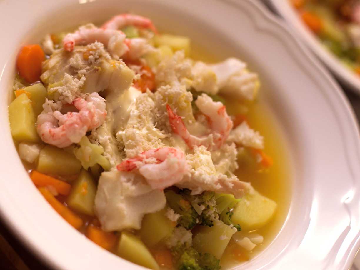 Tor på Holmens fisksoppa med grönsaker och räkor