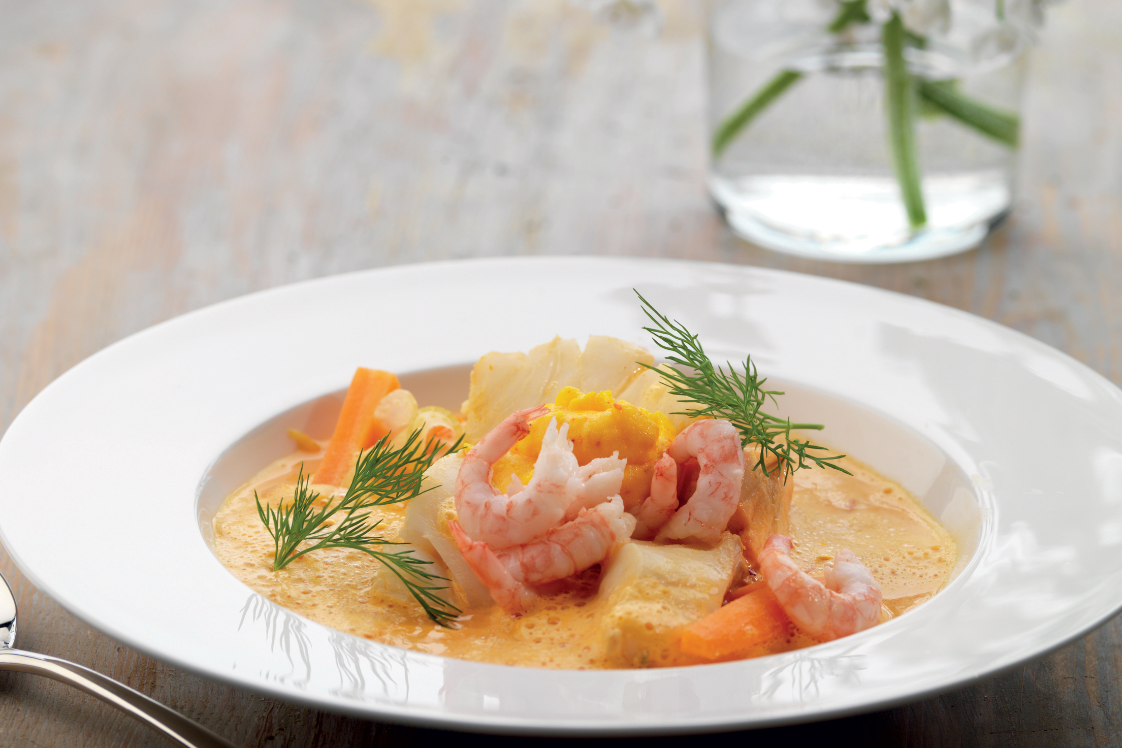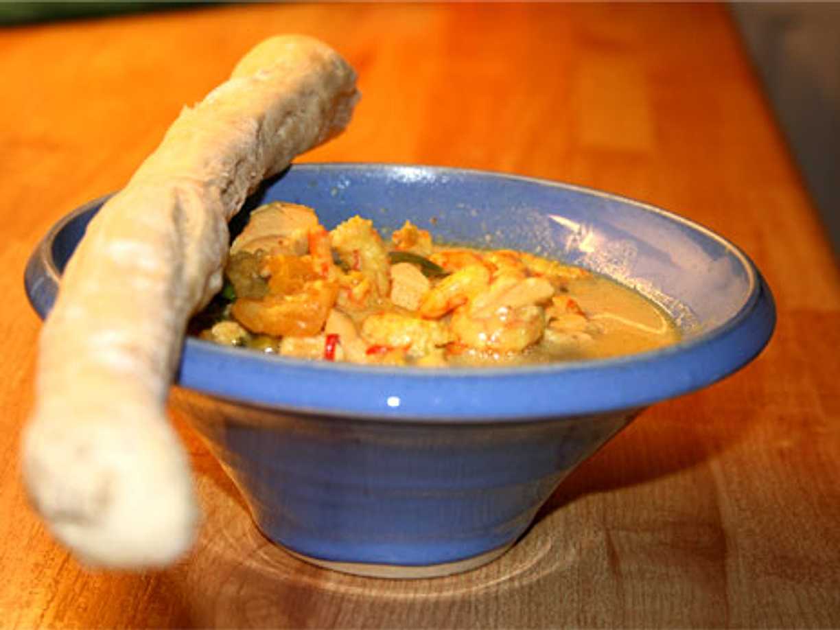 Het fisksoppa med curry och räkor