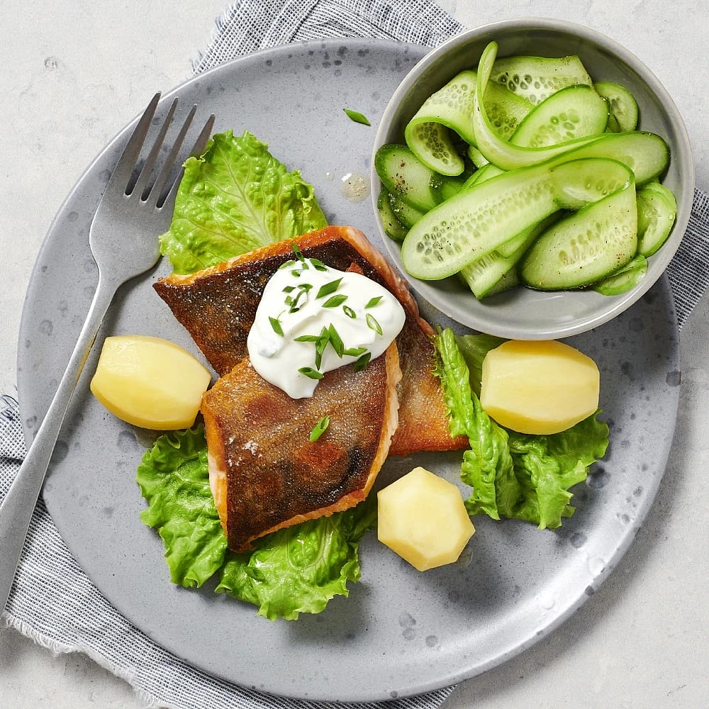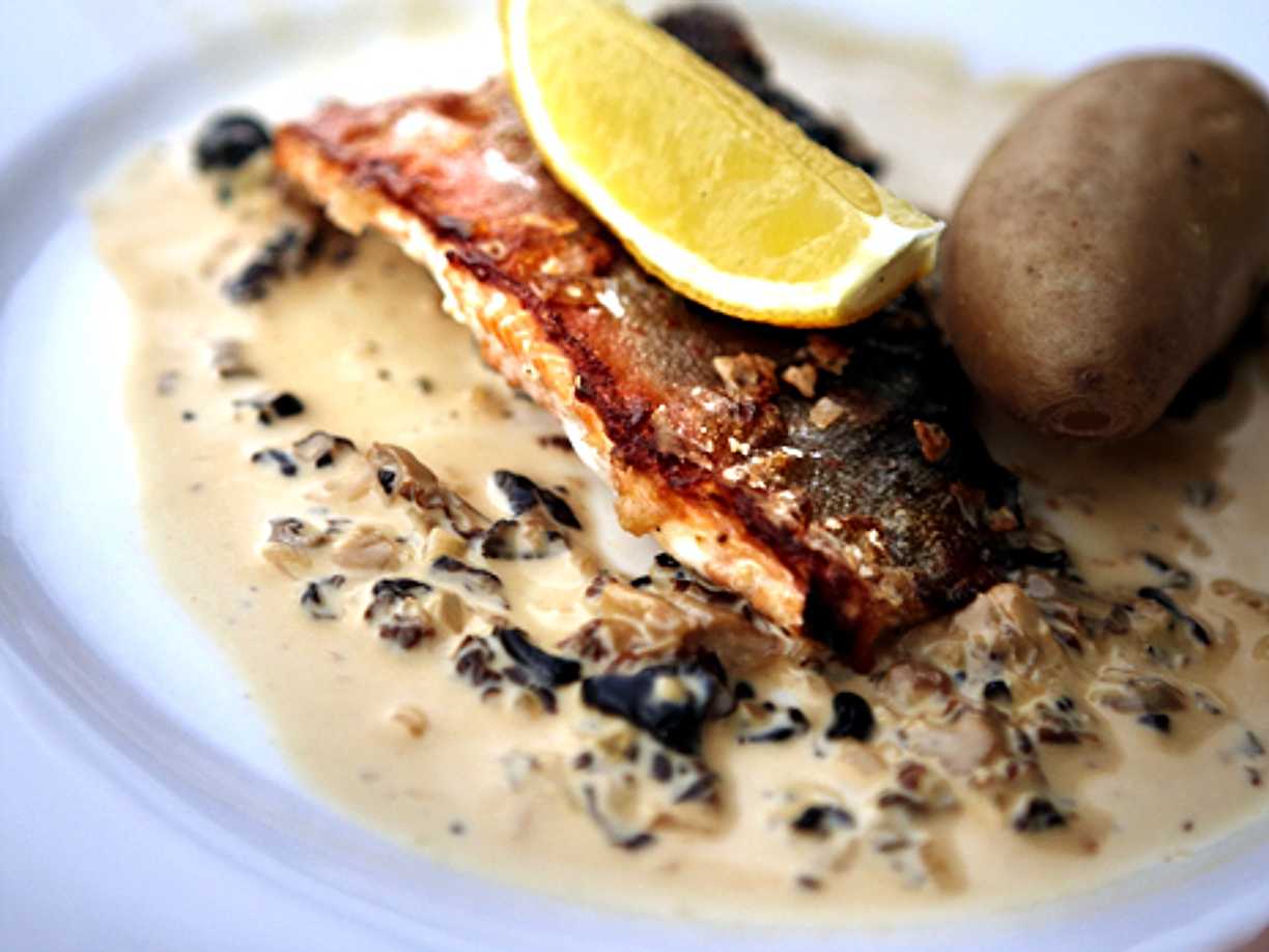 Stekt fjällröding med persiljerötter, syrad lök och senapsgrädde