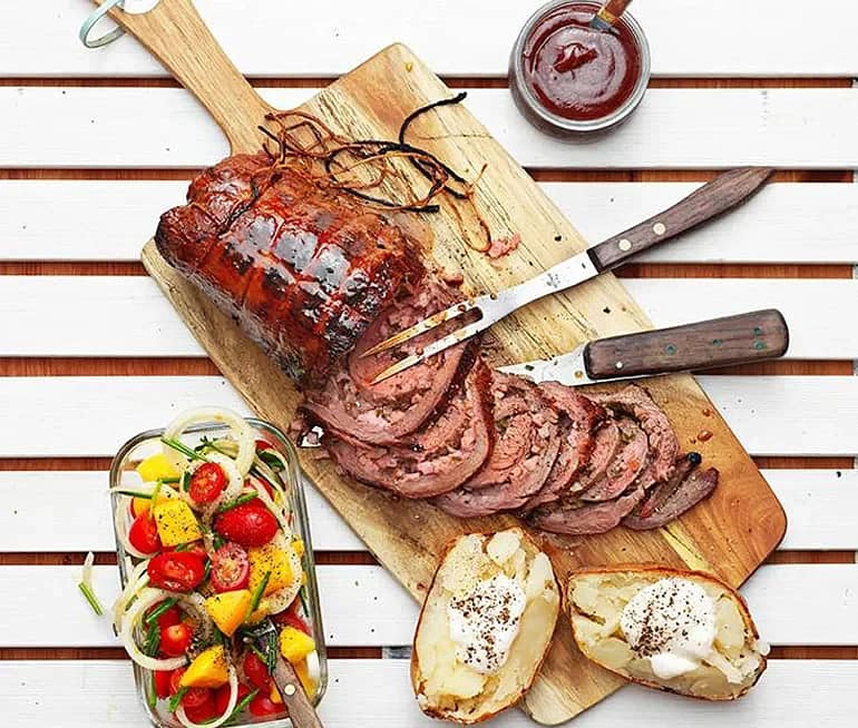 Rubbad flankstek med lättrökt potatissallad, chèvrekräm och ramslökssmör