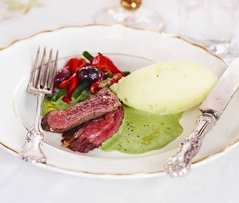 Flankstek med syrad rödkål, het myntacremé och krossade potatisar