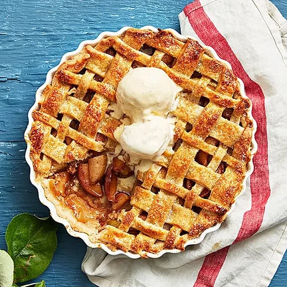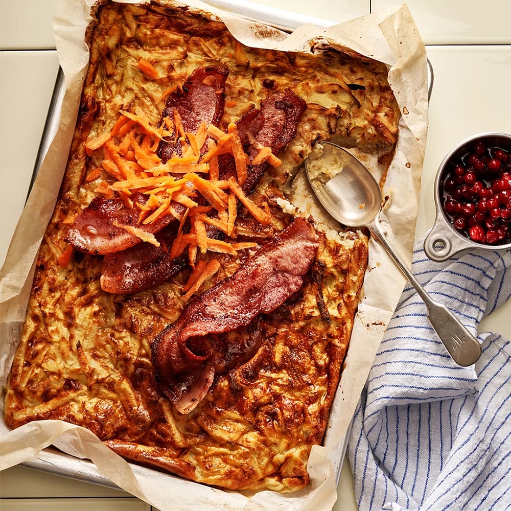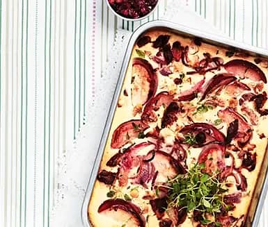 Ugnspannkaka med fläsk, timjanäpplen och rostade nötter