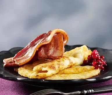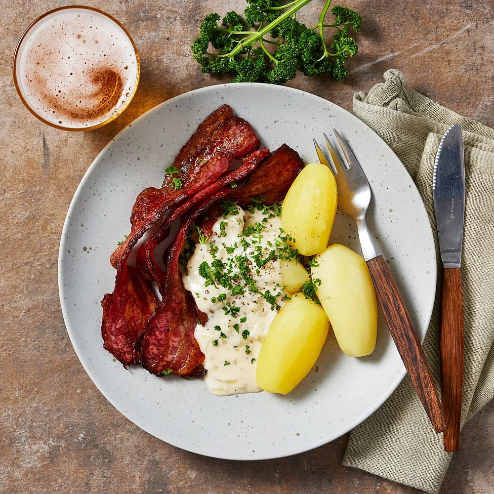 Toms raggmunk med stekt fläsk, lingon och persiljesallad