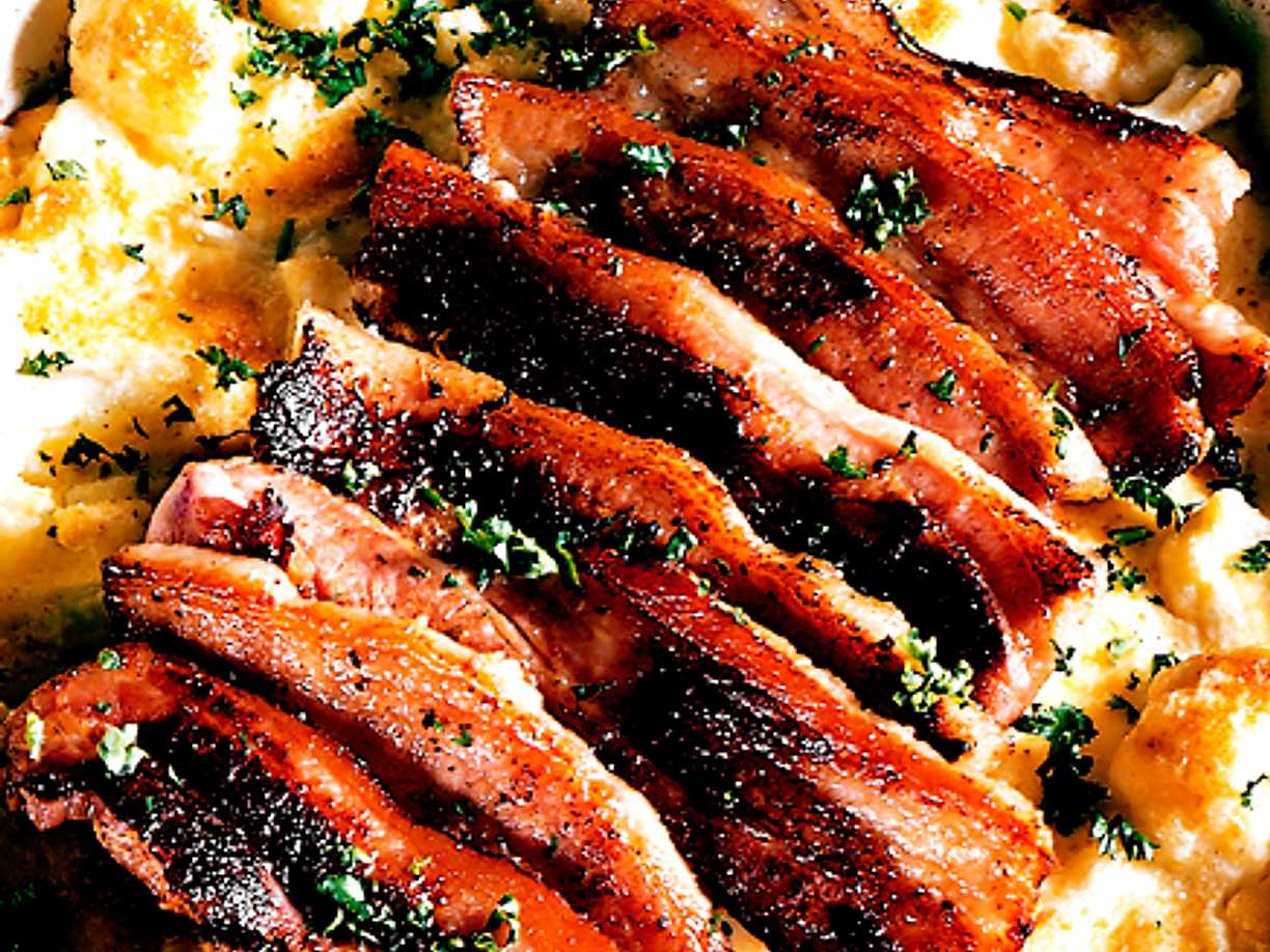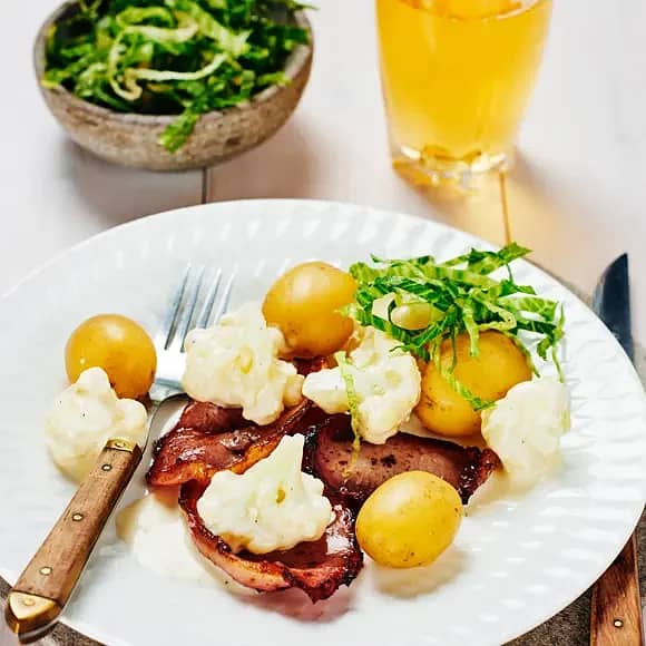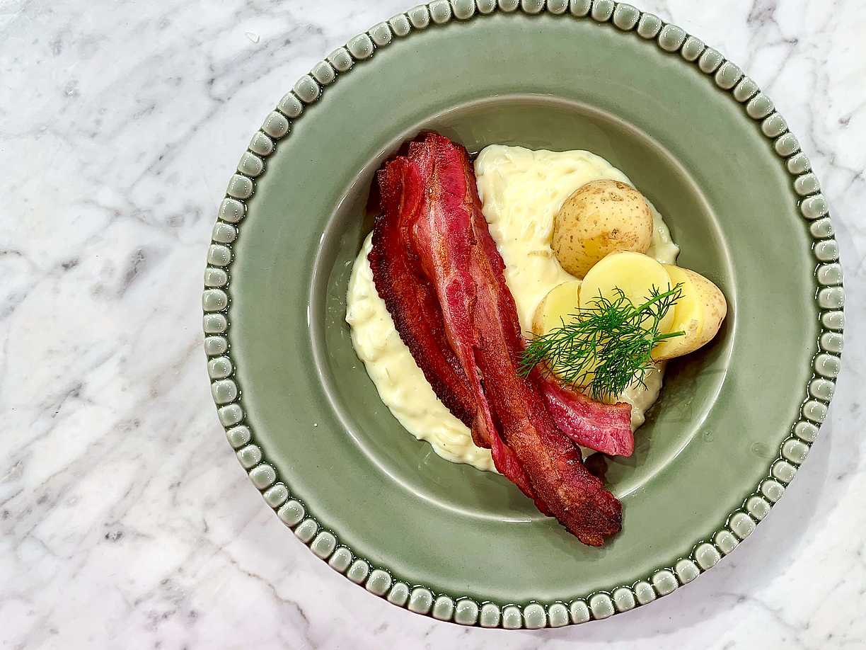 Bräserad gös med brynt fläsk i smörsås och rotmos
