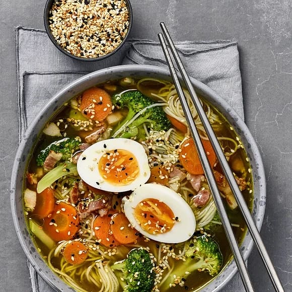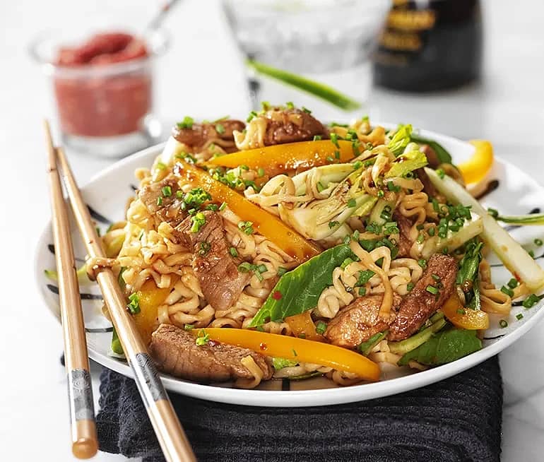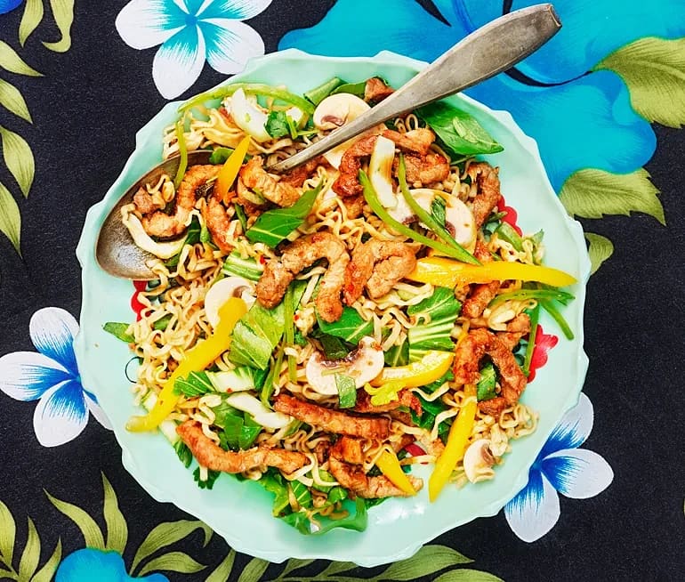 Krämiga nudlar med svamp, fläsk och het sesamsås