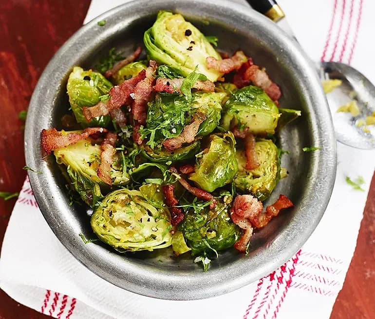 Apelsinstekt brysselkål med knaperstekt fläsk