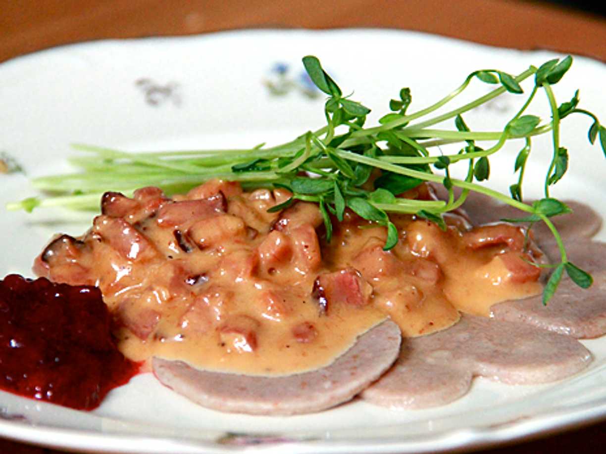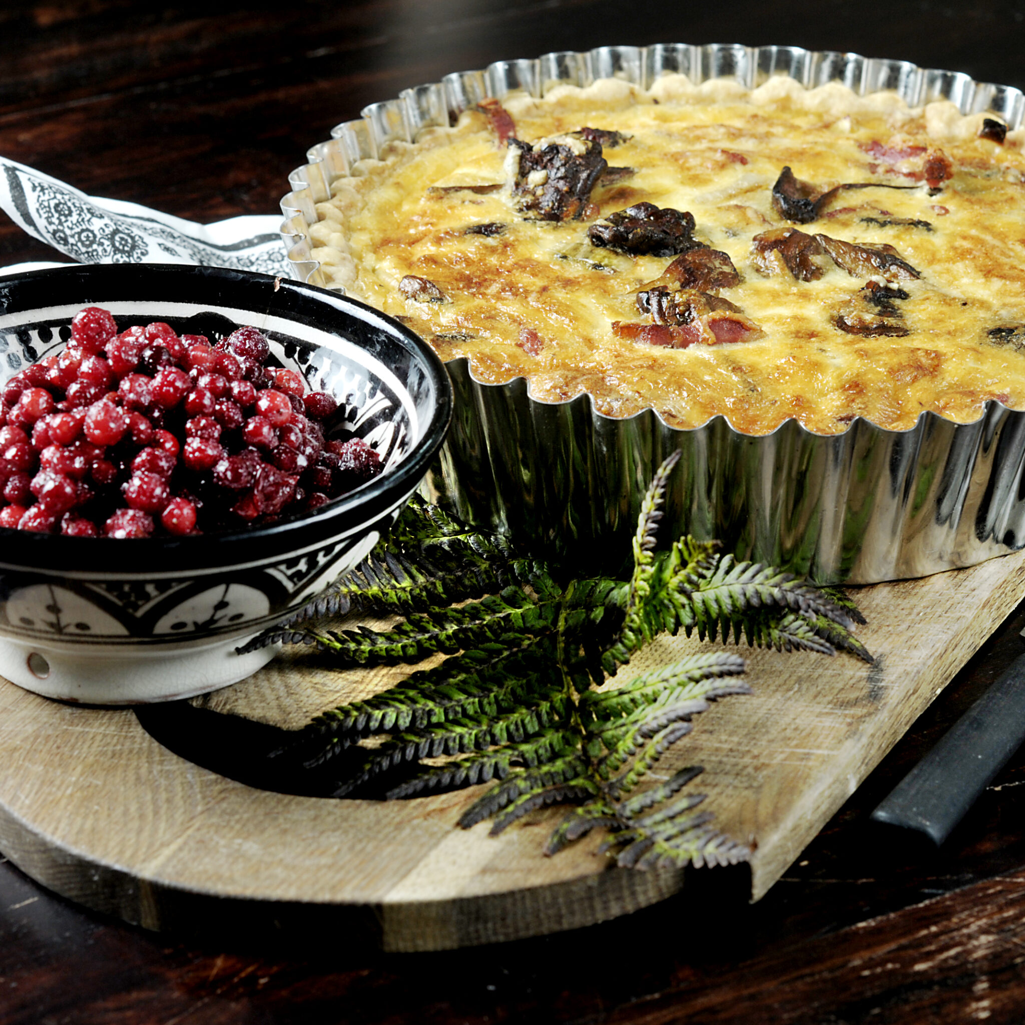Karljohansvamppaj med stekt fläsk och parmesan med whiskyspetsade lingon