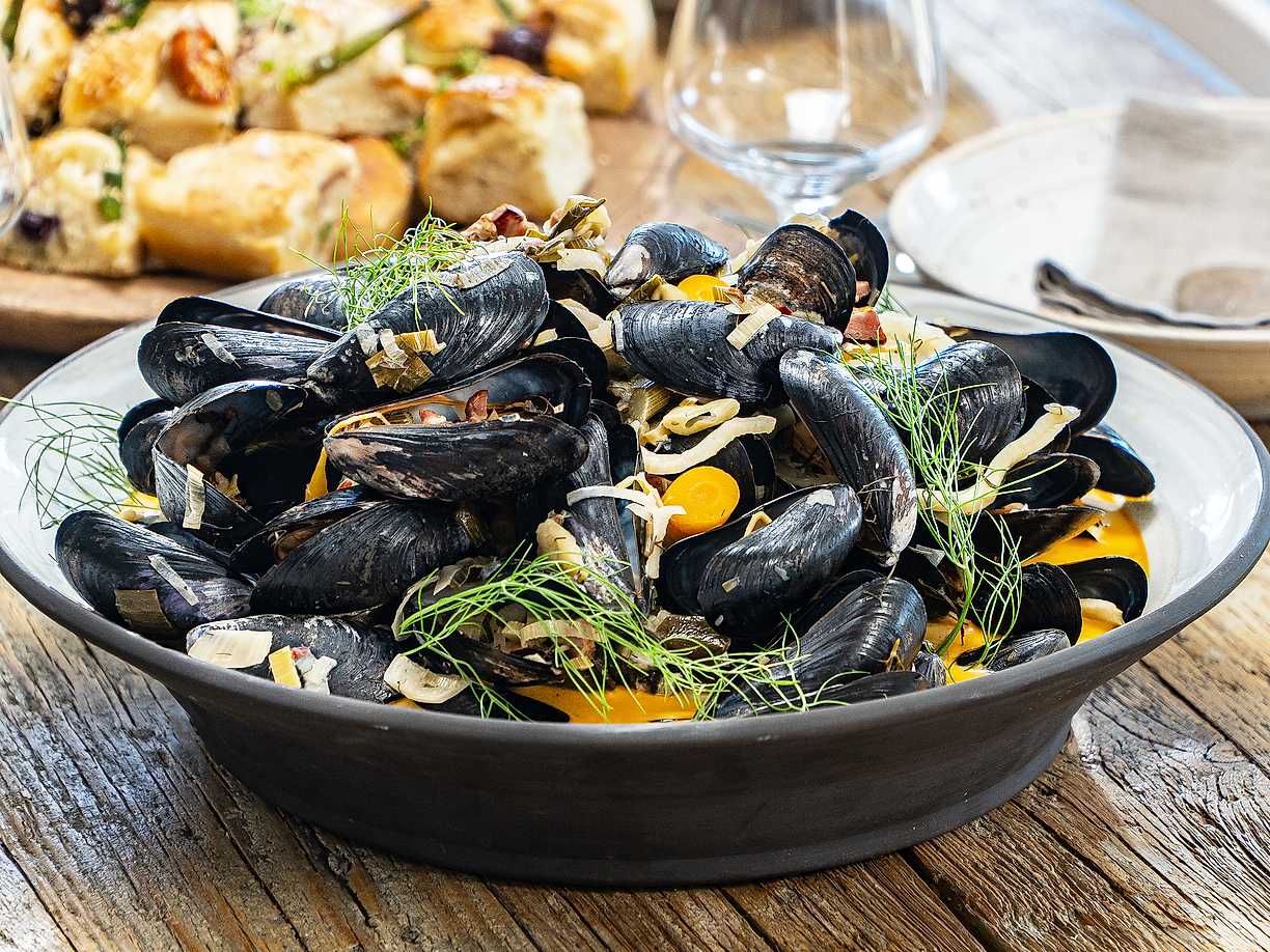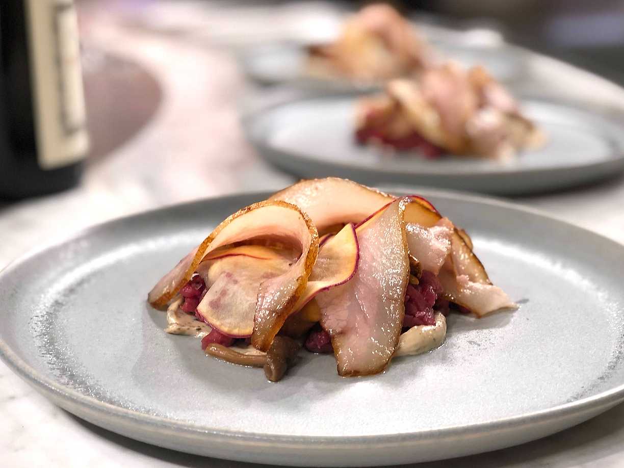 Bakad rotselleri med örtsmör, gräddkokt kål med tryffel, rostad mandel och knaperstekt fläsk