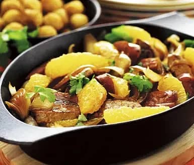 Fläskfilégryta med paprikakorv och apelsin