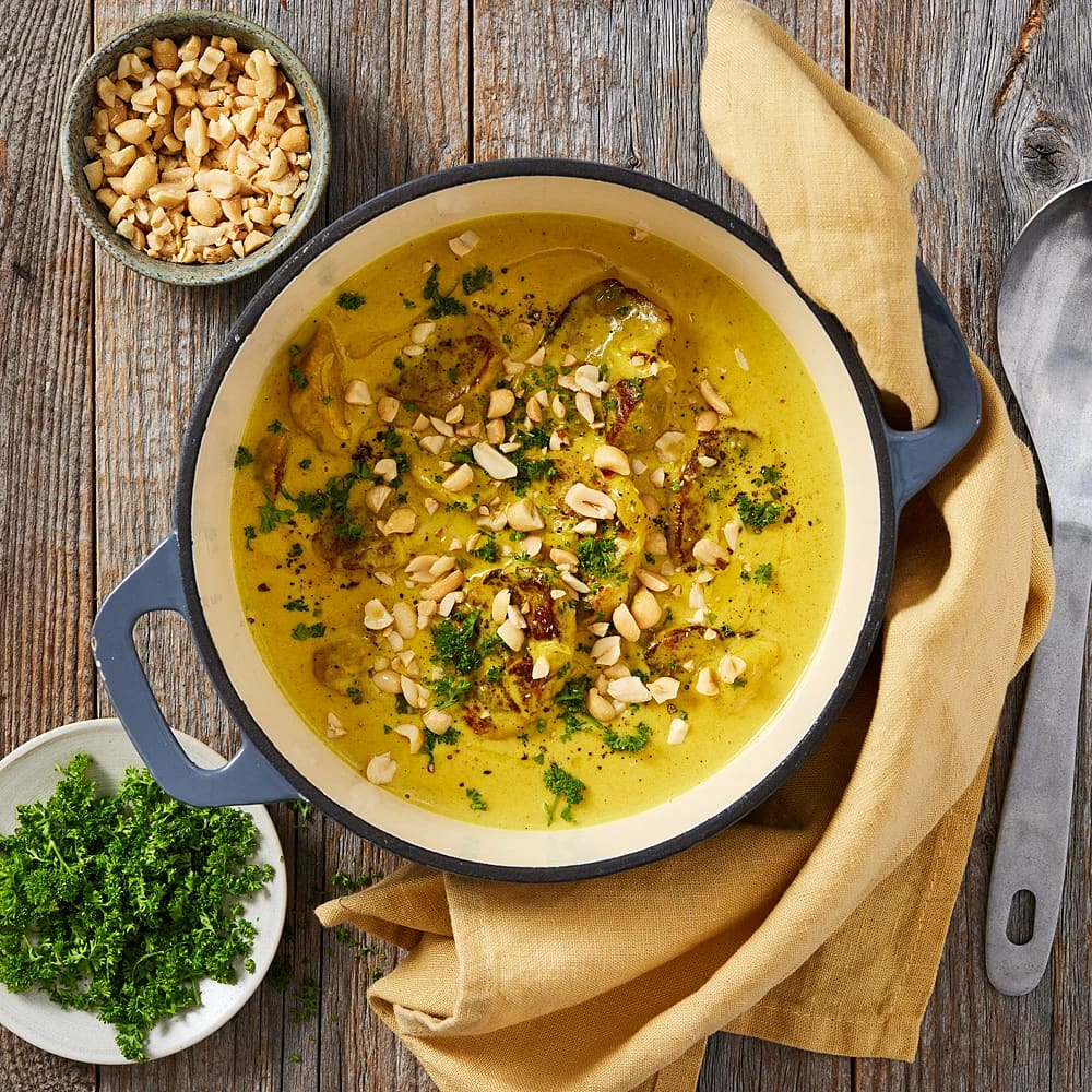 Fläskfilégryta med curry, banan och jordnötter