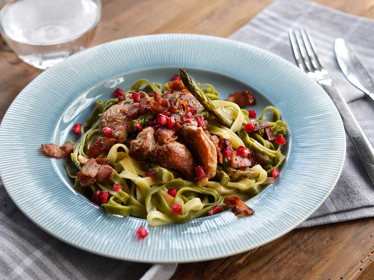 Fläskfilépasta med smörsky och baconströssel
