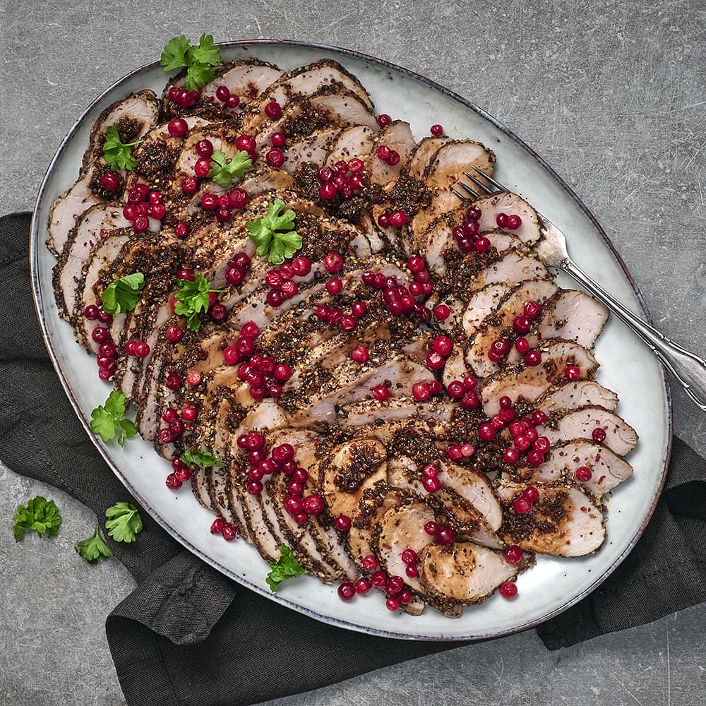 Helstekt fläskytterfilé med smak av citrontimjan och sardeller