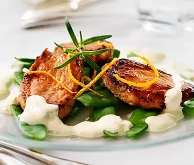Fläskytterfilé med apelsin- och rosmarinsås och sockerärter