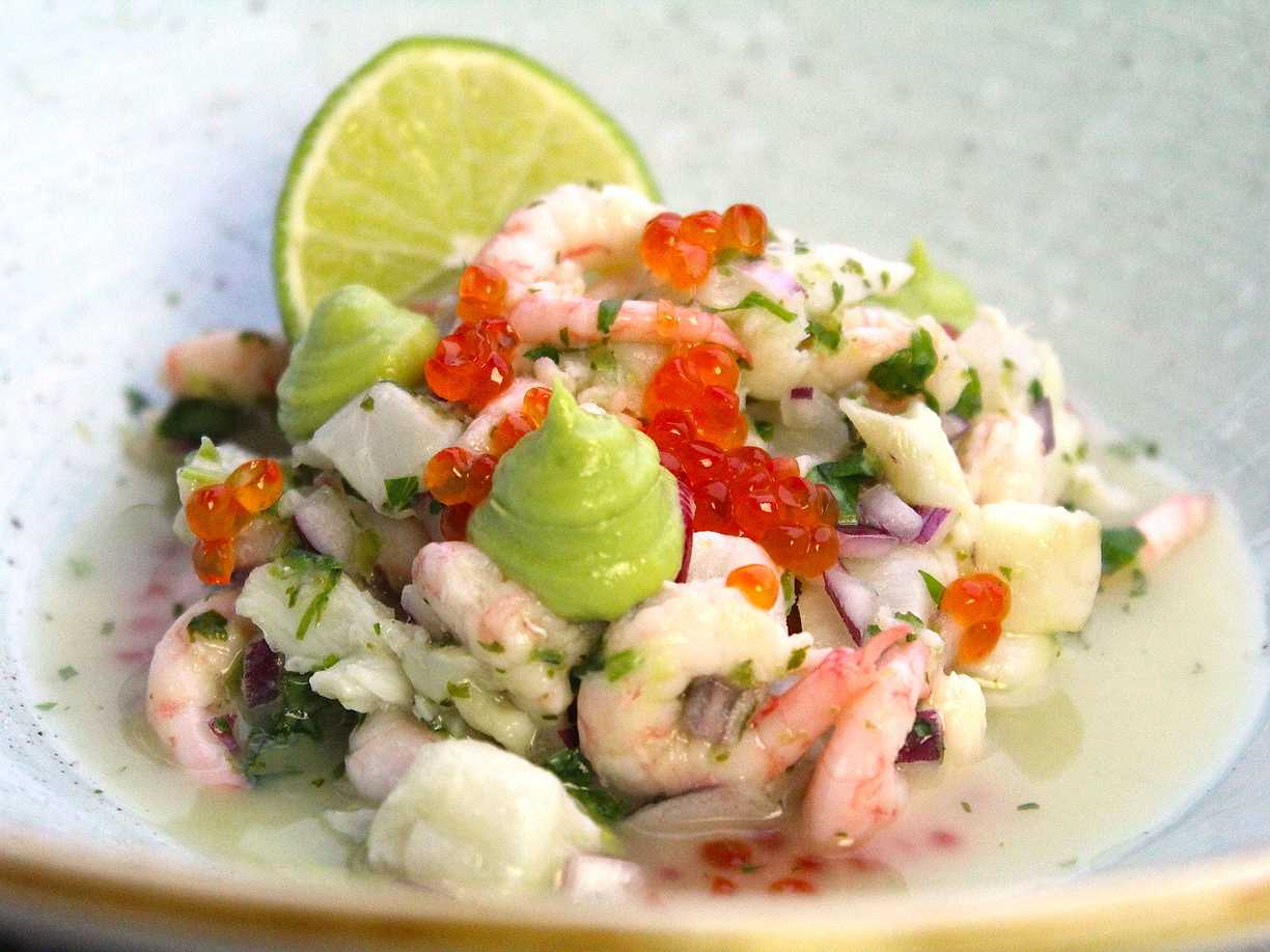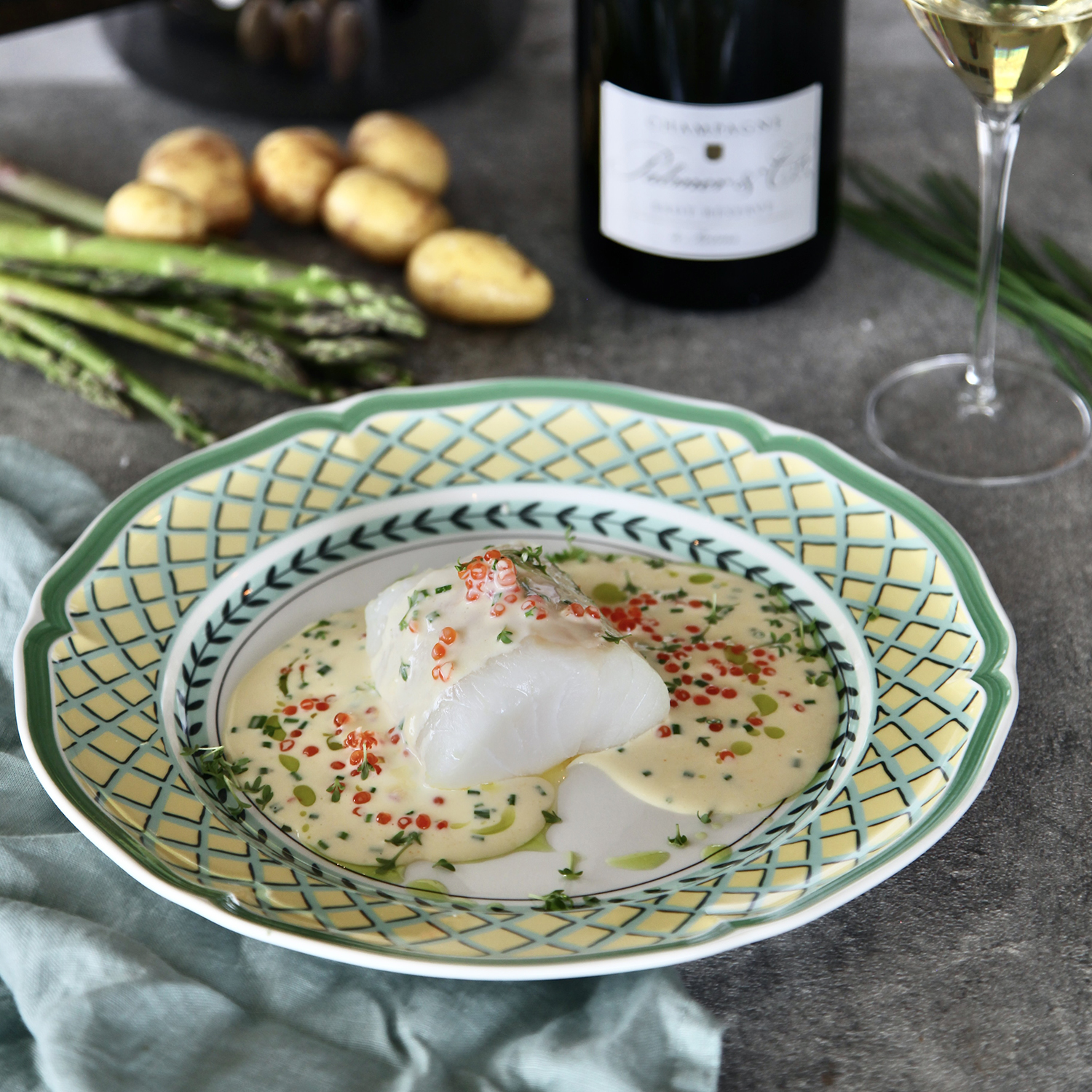Smörstekt gös med ärtpuré, stekta trattkantareller, picklad rädisa, pepparrotssås och forellrom