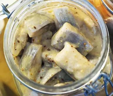 Matjessill med brynt lök, lagrad ost och gräddfil