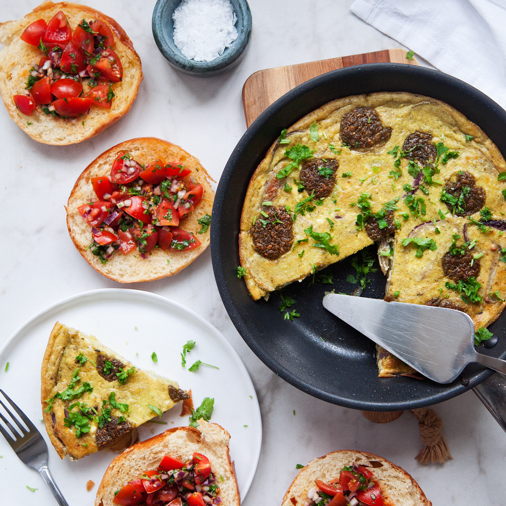 Grönsaksfrittata med ricottapesto och bruschetta