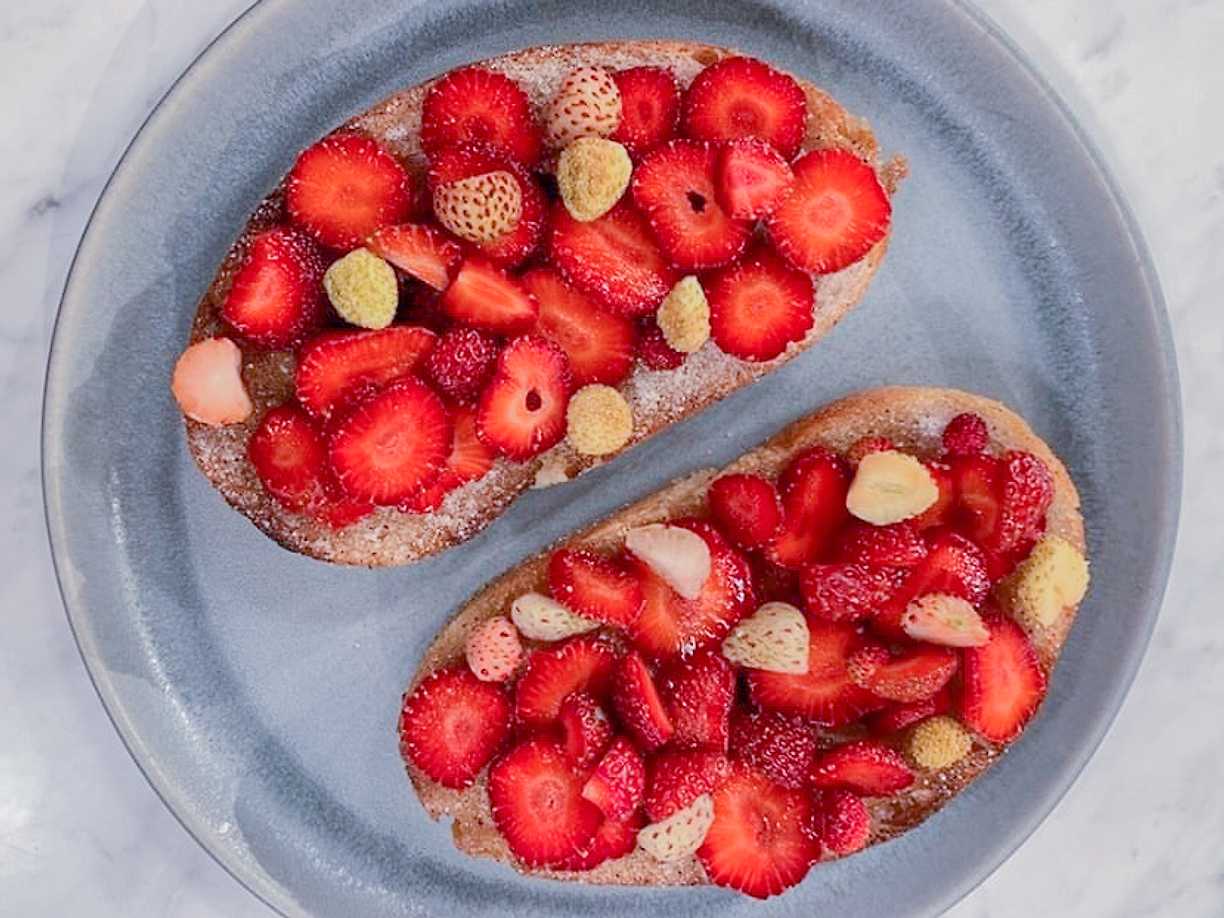 Crostini med chèvrekräm, jordgubbar, basilika och balsamico